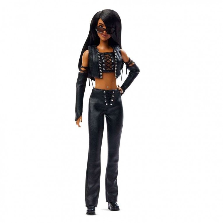 Η ειδική κούκλα Barbie Aaliyah φοράει ένα ολόμαυρο σύνολο εμπνευσμένο από το μουσικό της βίντεο One in a Million, τιμώντας τη μοναδική μόδα και την αιώνια επιρροή της.