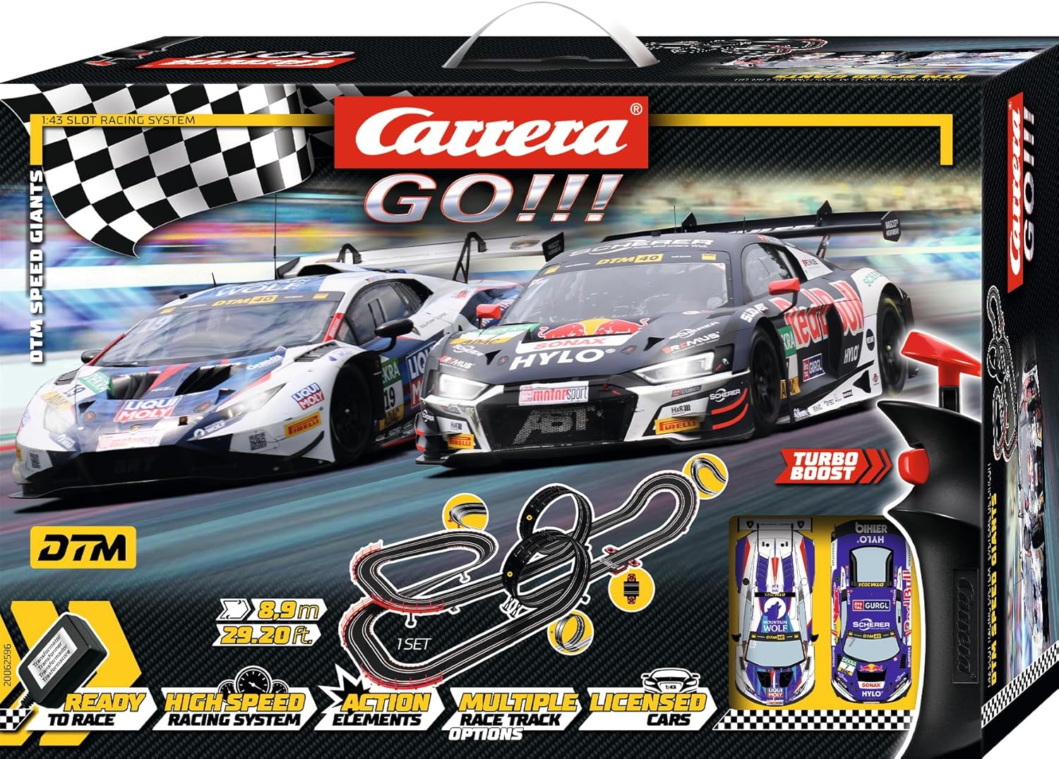 Ζήστε την απόλυτη δράση DTM με το Carrera GO!!! Speed Giants Set, ένα σετ αναλογικών αγώνων αυτοκινήτων 1:43 που προσφέρει υψηλή ποιότητα και αξιοπιστία. Ιδανικό για ενθουσιώδεις λάτρεις των αγώνων, το σετ περιλαμβάνει Audi R8 LMS GT3 evo II DTM Abt, R. Feller, No.7 και Lamborghini Huracàn GT3 Evo II Luca Engstler, No.19, καθώς και όλα τα απαραίτητα αξεσουάρ για πλήρη αγωνιστική εμπειρία.