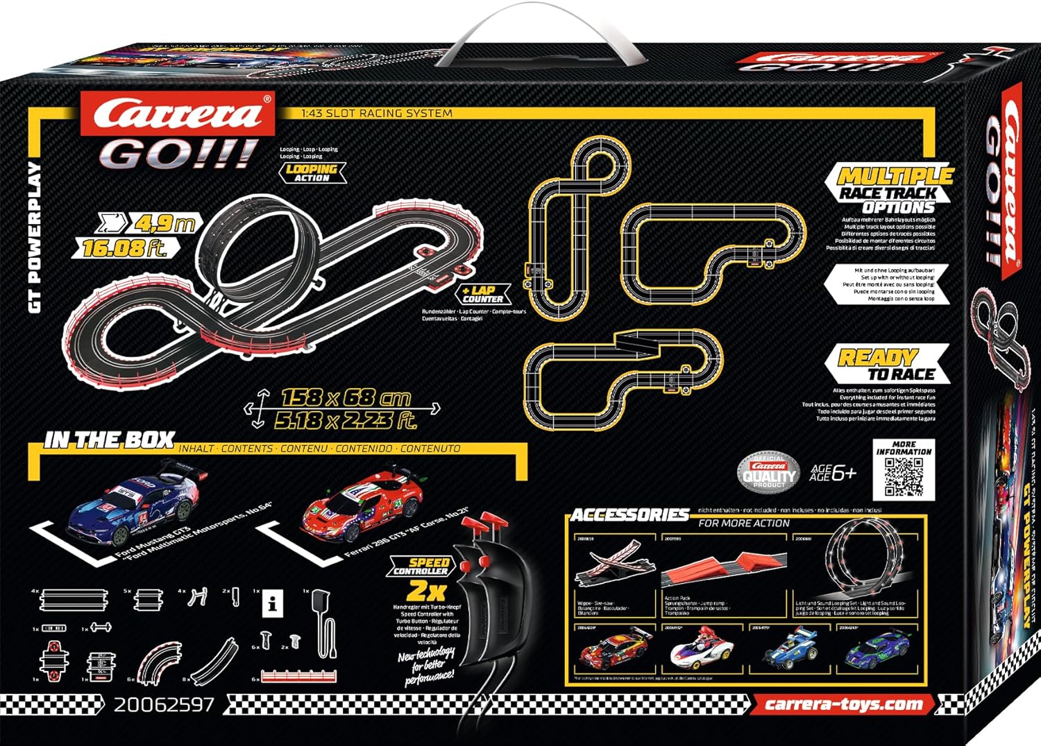 Ζήστε την αδρεναλίνη των αγώνων GT με το Carrera GO!!! GT Powerplay Racing Circuit, ένα αναλογικό σετ αυτοκινήτων 1:43 κατάλληλο για παιδιά 6 ετών και άνω. Το σετ περιλαμβάνει δύο λεπτομερή GT3 αγωνιστικά οχήματα και πίστα μήκους 4,9 μέτρων με δυναμικά στοιχεία για συναρπαστικούς αγώνες δύο παικτών.