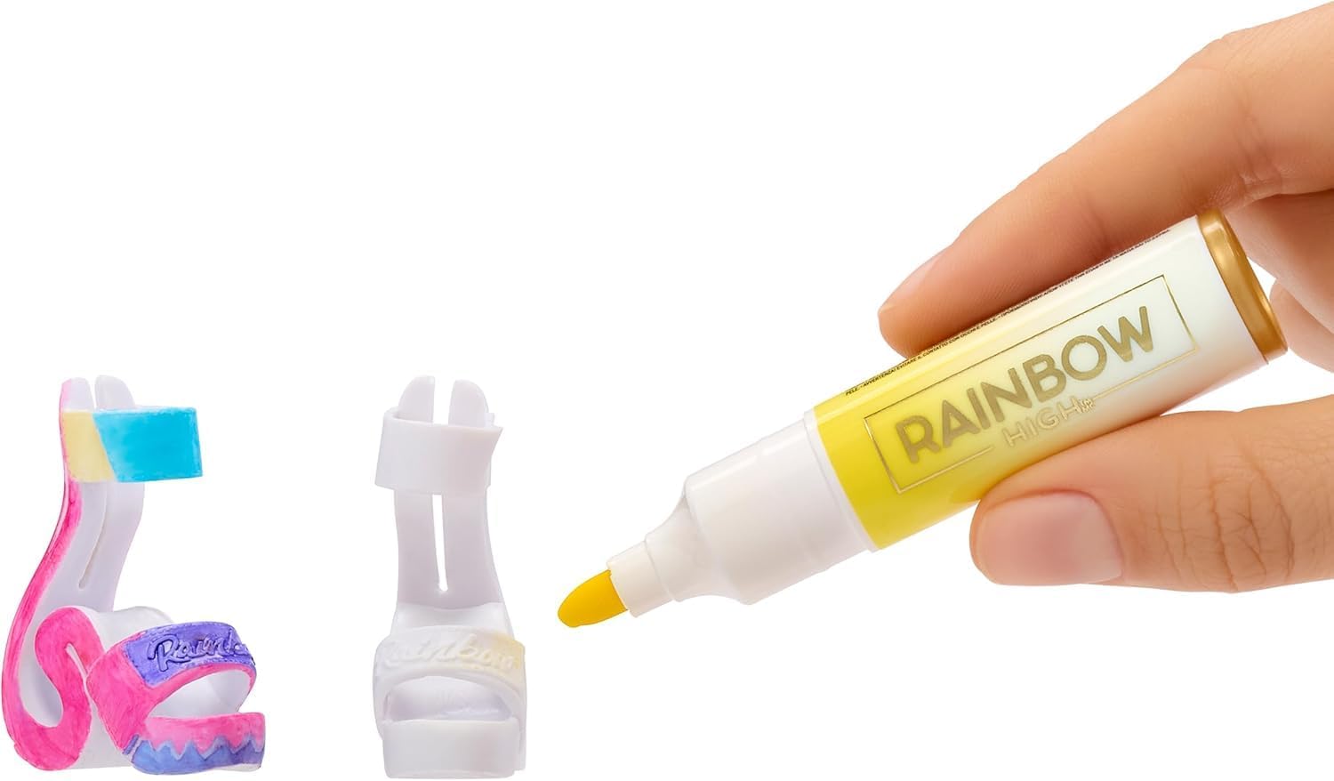 Το σετ περιλαμβάνει Air Brush, 4 πλενόμενους μαρκαδόρους rainbow (κόκκινο, κίτρινο, μπλε, μωβ) και πλήρως ντυμένη κούκλα μόδας. Απλώς εισάγετε έναν μαρκαδόρο στο airbrush, ψεκάστε και παρακολουθήστε τα μαγικά αποτελέσματα να εμφανίζονται στα μαλλιά, τα ρούχα και τα παπούτσια. Για πιο λεπτομερές σχέδιο, χρησιμοποιήστε τον μαρκαδόρο απευθείας πάνω στο outfit.