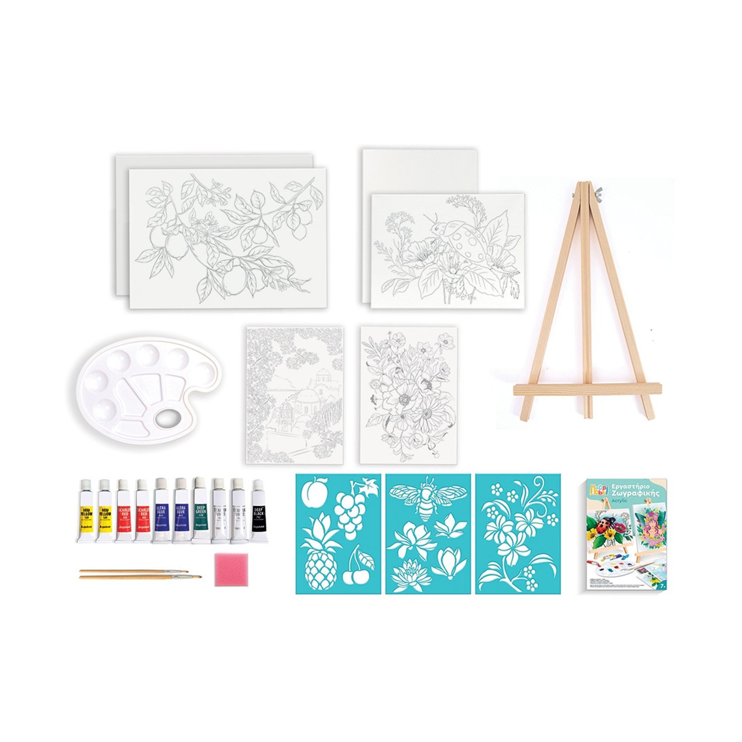 Το HappiHobbi Εργαστήριο Ζωγραφικής Aκρυλικό είναι το ιδανικό σετ για να μάθει το παιδί να ζωγραφίζει με την τεχνική του ακρυλικού. Σχεδιάστε πίνακες σε καμβά επάνω στο ξύλινο καβαλέτο που περιλαμβάνεται και δώστε ζωή στα προτυπωμένα σχέδια. Είναι κατάλληλο για παιδιά που έχουν την πρώτη τους εμπειρία με την τεχνική του ακρυλικού, καθώς περιλαμβάνει εικονογραφημένο αναλυτικό οδηγό που καθοδηγεί βήμα-βήμα το παιδί στην πρώτη του επαφή και την εξοικείωσή του με την τεχνική. Επιπλέον, είναι εξίσου κατάλληλο για παιδιά με εμπειρία, αφού το πλούσιο περιεχόμενό του επιτρέπει να χρωματίσουν προ-τυπωμένες καρτολίνες, να δημιουργήσουν δικά τους έργα σε λευκό καμβά χρησιμοποιώντας τα stencils, αλλά και να εξασκήσουν περαιτέρω τη φαντασία και το ταλέντο τους σε ελεύθερο σχέδιο.