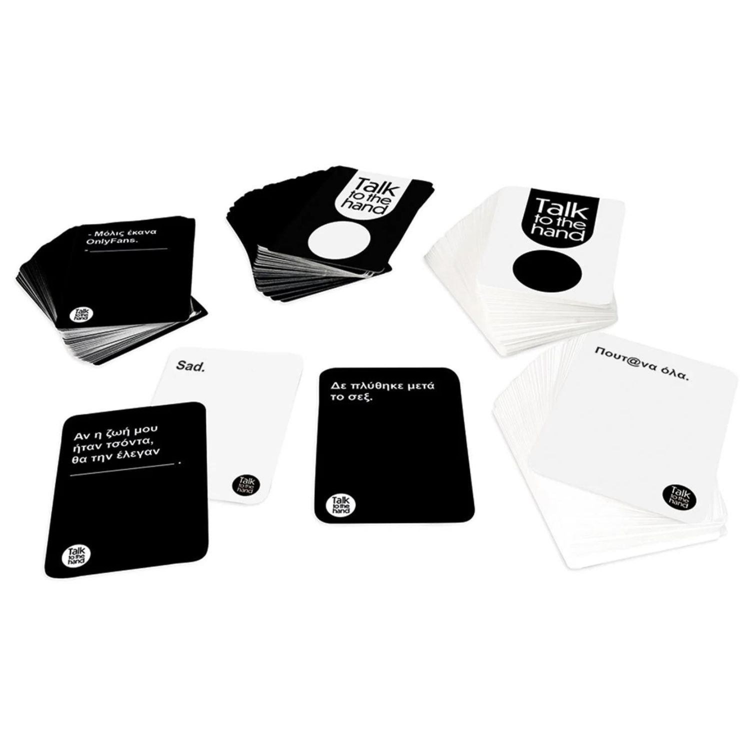 - Το παιχνίδι περιλαμβάνει – 30 μαύρες κάρτες – 180 λευκές κάρτες – Φυλλάδιο οδηγιών *Για προσθήκη στη βασική έκδοση Talk To The Hand Το προϊόν διαθέτει περιεχόμενο το οποίο απευθύνεται αυστηρά σε ενήλικες.