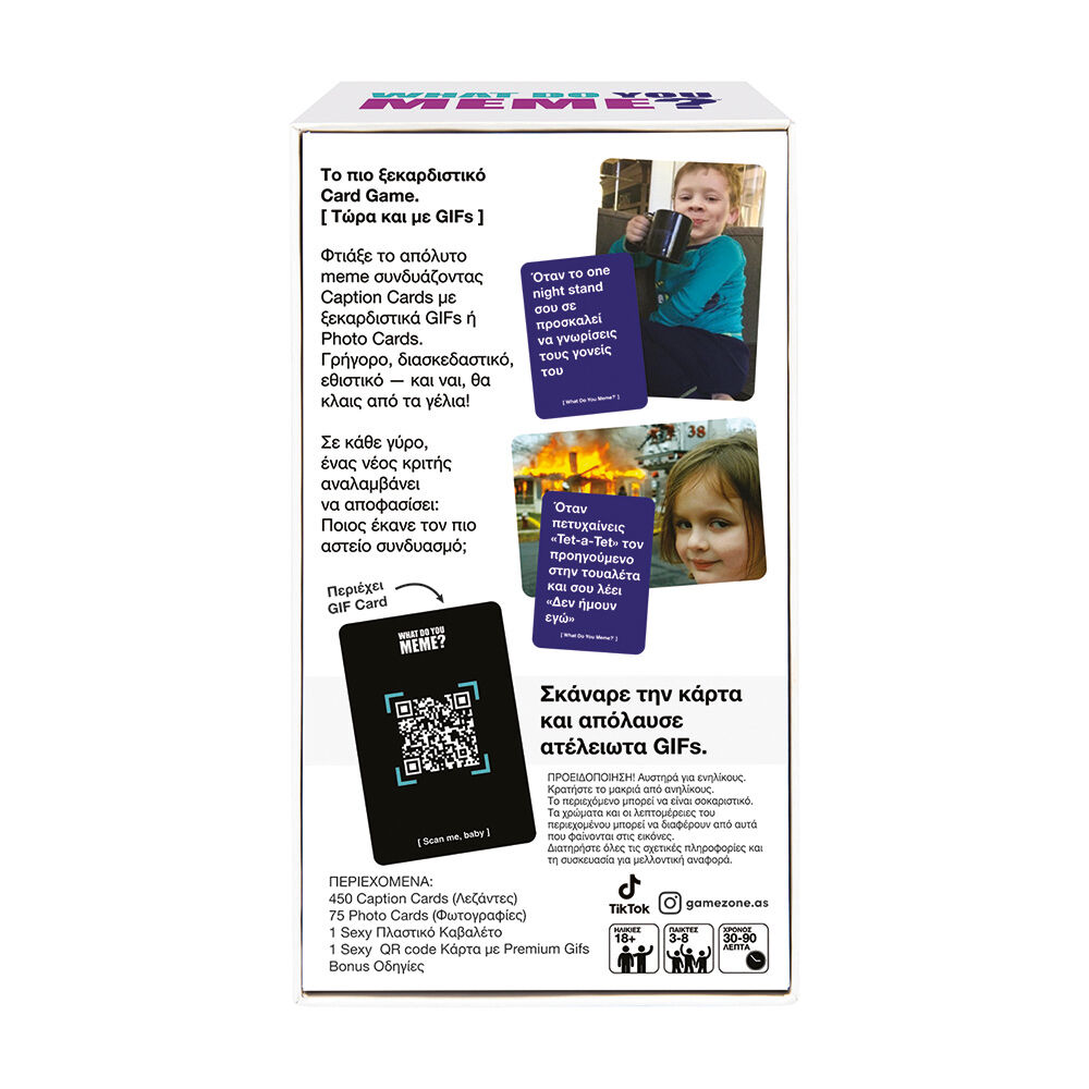 Το What Do You Meme… παρουσιάζεται πλέον και με GIFs, προσφέροντας μια πλήρως αναβαθμισμένη εμπειρία παιχνιδιού για ενήλικες. Πρόκειται για ένα party game υψηλού επιπέδου, σχεδιασμένο να συνδυάζει ευφυΐα και χιούμορ.