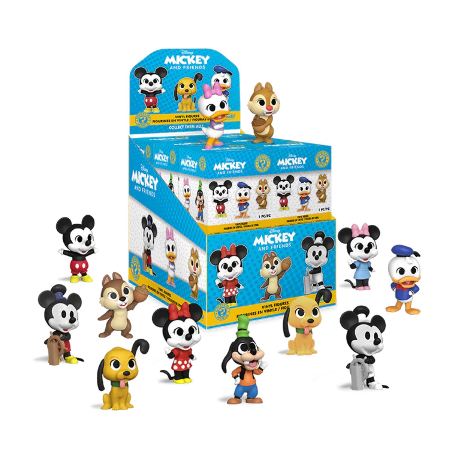 Ποιος χαρακτήρας θα βρείτε; Υπάρχουν οι Mickey, Minnie, Donald, Pluto, Daisy Duck, Steamboat Willie (μαύρο-άσπρο), Chip, Dale, Minnie Mouse (μπλε/ροζ), Goofy, Pluto (flocked) και Steamboat Willie (σε χρώμα). Οι φιγούρες από βινύλιο κυμαίνονται σε ύψος ανάλογα με τον χαρακτήρα, από περίπου 5,7 εκ. έως 7,6 εκ..