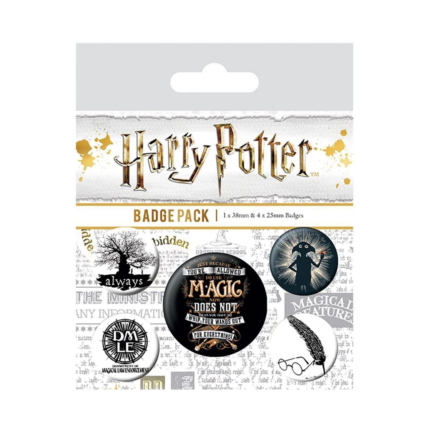 Η συσκευασία περιλαμβάνει 5 επίσημα αδειοδοτημένες καρφίτσες, τα οποία αποτυπώνουν σύμβολα από το σύμπαν του Harry Potter.