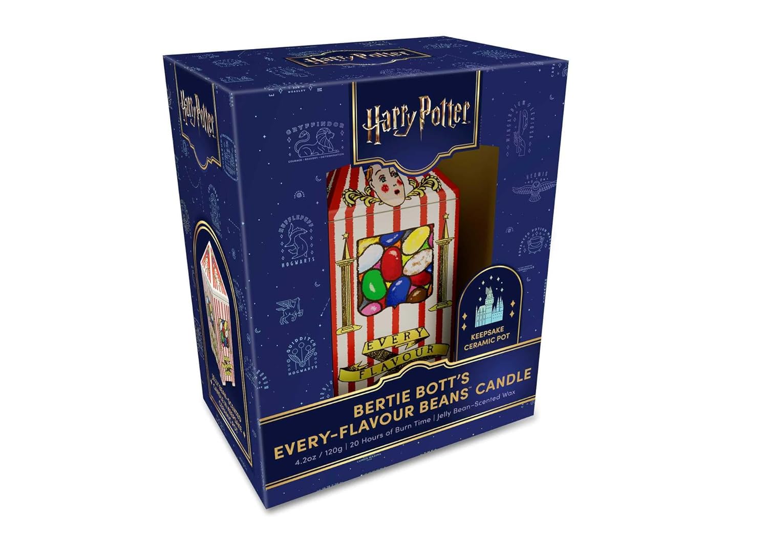Το Αρωματικό Κερί Harry Potter Bertie Botts Candle φωτίζει το χώρο σας με ένα κερί από υψηλής ποιότητας σόγια, αρωματισμένο με γλυκές γεύσεις ζελεδάκια (jellybean), τοποθετημένο σε συλλεκτικό κεραμικό δοχείο εμπνευσμένο από τη συσκευασία των Bertie Bott's Every-Flavour Beans™ από τις αγαπημένες ταινίες Harry Potter™.