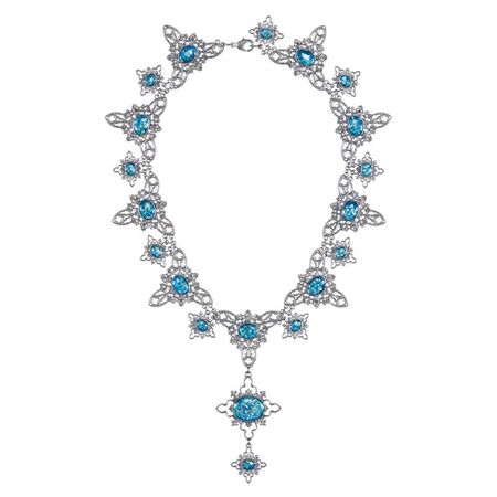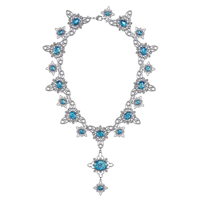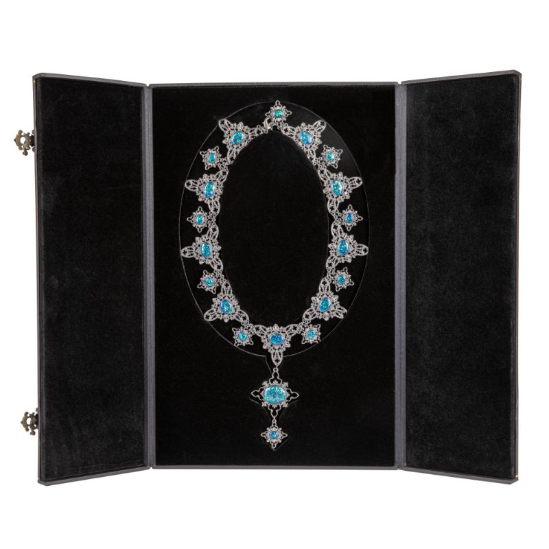 Ανακαλύψτε μία αυθεντική αναπαραγωγή prop του καταραμένου κολιέ οπαλίου από το Harry Potter and the Half-Blood Prince, με aged silver φινίρισμα και 20 ιριδίζουσες μπλε πέτρες, σε συλλεκτικό leatherette κουτί προβολής 13″. Το αντικείμενο αναπαράγει κάθε ανατριχιαστική λεπτομέρεια του πρωτότυπου, διαθέτει ρυθμιζόμενο κούμπωμα και μετρά περίπου 6.5″ x 11.5″ — ιδανικό για συλλέκτες 14+.