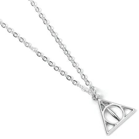 Το Κολιέ Harry Potter Deathly Hallows Necklace απεικονίζει το σύμβολο των Deathly Hallows, που αντιπροσωπεύει τα τρία πιο ισχυρά μαγικά αντικείμενα στον κόσμο των μάγων: την Φαεινή Ράβδο, την Πέτρα της Ανάστασης και το Μανδύα Αορατότητας. Το μενταγιόν έχει διαστάσεις περίπου 15 mm ύψος και 15 mm πλάτος, ενώ η αλυσίδα είναι επιχρωμιωμένη μήκους 40 cm με επέκταση 5 cm, προσφέροντας ευκολία στη ρύθμιση. Η αλυσίδα είναι κατασκευασμένη από ασημένια επιχρωμιωμένη σύνδεση και το προϊόν συνοδεύεται από επίσημη συσκευασία με σήμανση Harry Potter, εξασφαλίζοντας την αυθεντικότητα και την ποιότητα του.