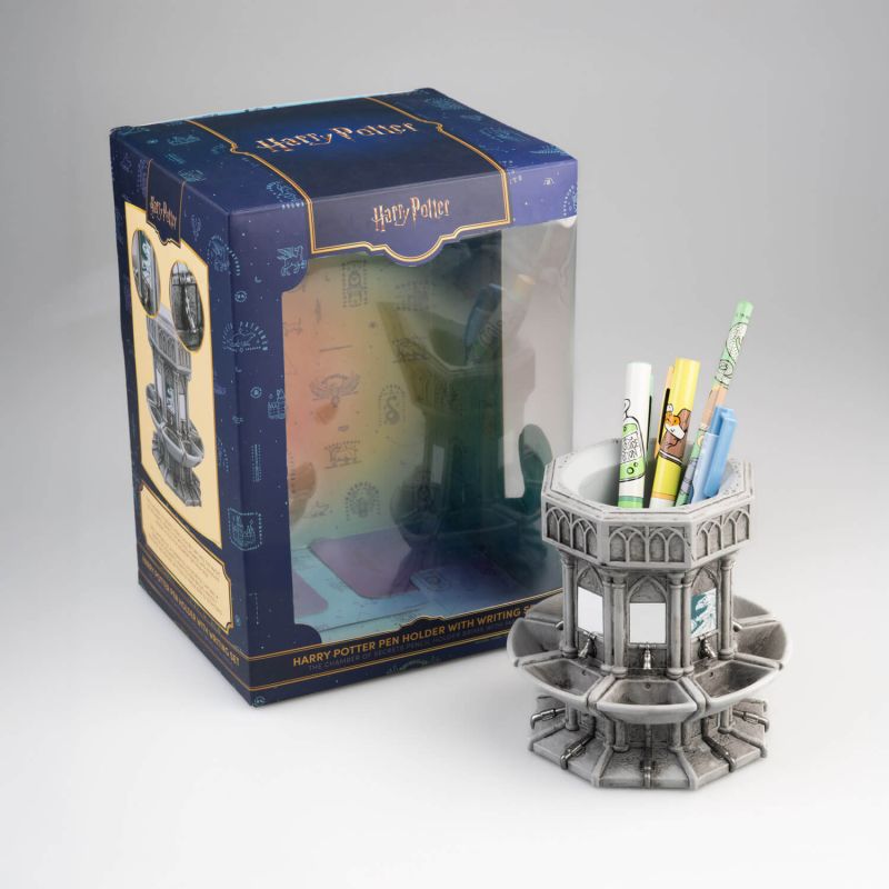 Η Harry Potter μολυβοθήκη αποτυπώνει σε 3D σχέδιο το νεροχύτη που οδηγεί στην Κάμαρα των Μυστικών, προσφέροντας έναν μοναδικό τρόπο να αποθηκεύετε τα μολύβια και στυλό σας. Μαζί με τη μολυβοθήκη, το σετ περιλαμβάνει τρία στυλό, ένα μολύβι και ένα ξύστρα, ιδανικά για το σχολείο ή το γραφείο. Κατασκευασμένη από υψηλής ποιότητας κεραμικό, η μολυβοθήκη είναι επίσημο προϊόν Harry Potter και προσθέτει μαγεία και αυθεντικότητα σε κάθε γραφείο.