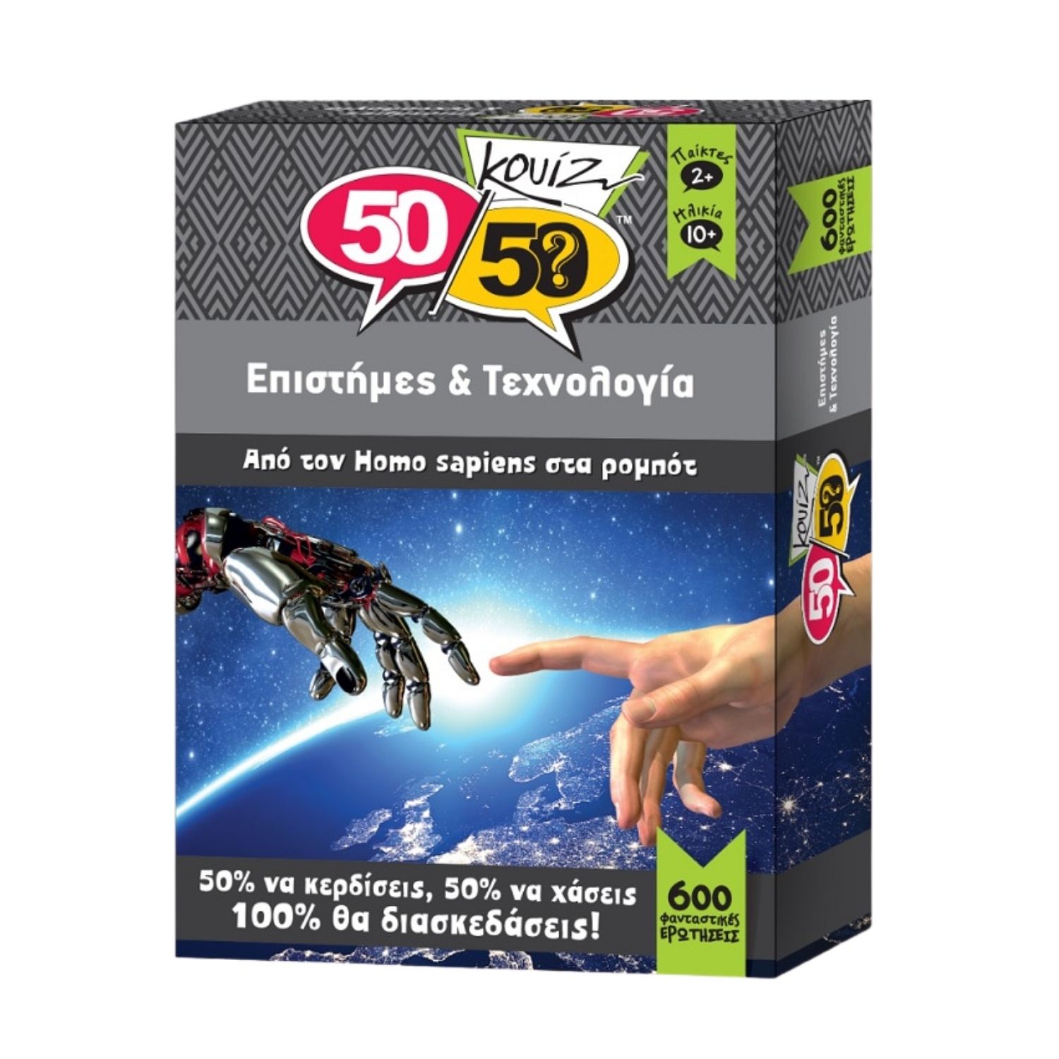 Το γυαλί είναι καλός ή κακός αγωγός του ηλεκτρισμού; Τι ανακάλυψε ο Νεύτωνας; Μπορούν δύο άνθρωποι να έχουν τα ίδια δακτυλικά αποτυπώματα; Τέσταρε τις γνώσεις σου και συναγωνίσου τους φίλους σου με το νέο επιτραπέζιο ερωτήσεων 50-50 Κουίζ Επιστήμες & Τεχνολογία! Με 600 ερωτήσεις που καλύπτουν ποικίλα θέματα, μαθαίνεις τις πιο ενδιαφέρουσες και αξιοπερίεργες πληροφορίες.