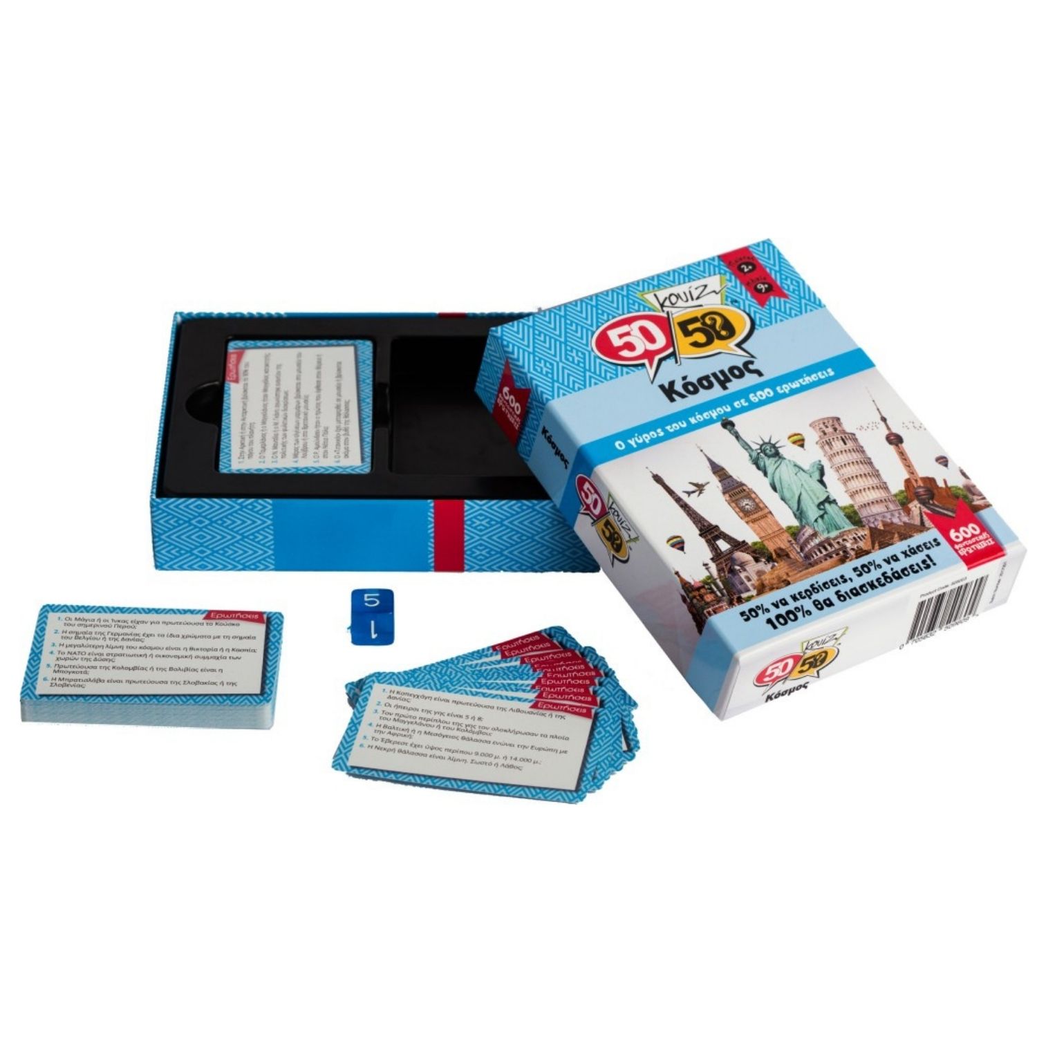 Το πιο συναρπαστικό ταξίδι σε όλο τον κόσμο είναι εδώ! Τέσταρε τις γνώσεις σου και συναγωνίσου τους φίλους σου με το νέο επιτραπέζιο ερωτήσεων 50-50 Κουίζ Κόσμος! Με 600 ερωτήσεις που καλύπτουν ποικίλα θέματα, μαθαίνεις τις πιο ενδιαφέρουσες και αξιοπερίεργες πληροφορίες.