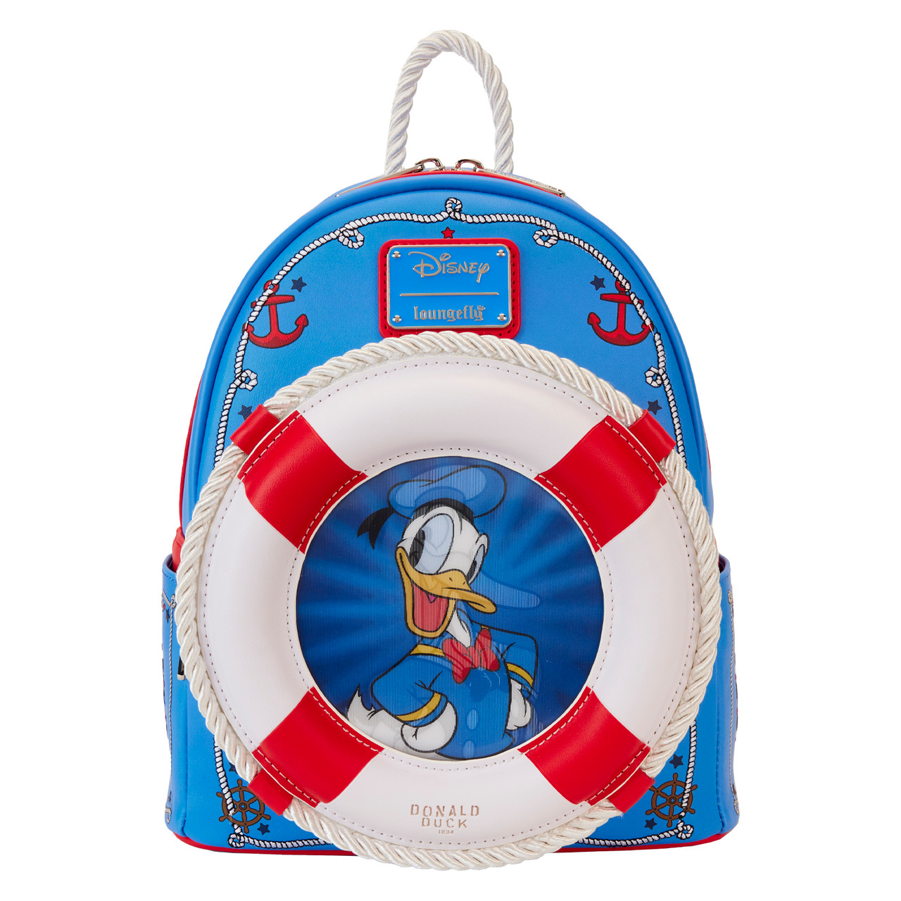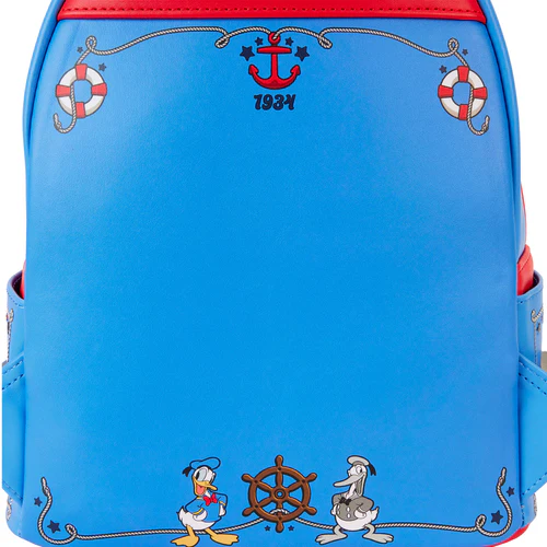 Ω, αγόρι, αγόρι—ahoy! Αποπλεύστε με στυλ και διασκέδαση! Ο Donald Duck της Disney είναι ο πρωταγωνιστής αυτής της λειτουργικής και χαριτωμένης τσάντας πλάτης. Η μπροστινή στρογγυλή τσέπη διαθέτει σωσίβιο με πραγματικό σχοινί, με το πρόσωπο του Donald Duck στο κέντρο. Οι λεπτομέρειες lenticular τον δείχνουν αρχικά ασπρόμαυρο, ενώ με μια κίνηση εμφανίζεται έγχρωμος. Σχέδια με αστέρια, άγκυρες και ναυτικά σχοινιά σε αυτό το μπλε backpack προσθέτουν χρώμα σε κόκκινο και σκούρο μπλε. Το πρωτότυπο artwork συνεχίζεται στις πλευρές και στην πλάτη, με την ένδειξη της ημερομηνίας επετείου 1934. Το πραγματικό σχοινί στην πάνω λαβή προσφέρει άνεση και ολοκληρώνει την εμφάνιση με προσωπικότητα. Γιορτάστε τα 90 χρόνια του Donald Duck με στυλ!