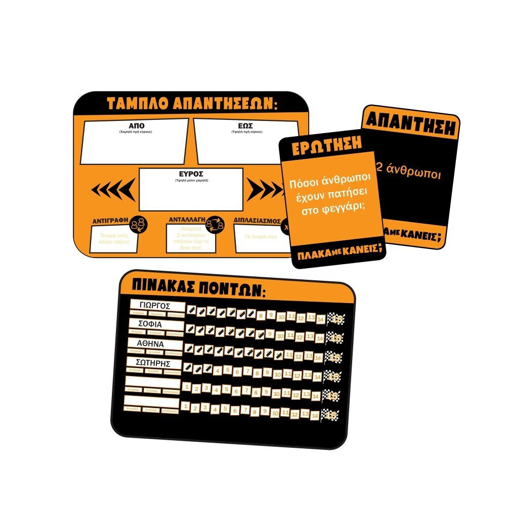 Ξέχνα τις κλασικές ερωτήσεις γνώσεων που σε αφήνουν με άδεια χέρια! Στο Πλάκα με Κάνεις;, δεν χρειάζεται να ξέρεις τη σωστή απάντηση – αρκεί να μαντέψεις σωστά... στο περίπου! Ένα παιχνίδι που ανατρέπει τους κανόνες και χαρίζει τη νίκη σε εκείνους που ξέρουν να σκέφτονται έξυπνα και να πλησιάζουν τη σωστή απάντηση χωρίς να την πετυχαίνουν ακριβώς. Όσο πιο κοντά είσαι, τόσο περισσότερους πόντους κερδίζεις, αλλά πρόσεξε – η υπερβολή μπορεί να σου στοιχίσει! Ιδανικό για 3-6 παίκτες και κατάλληλο για ηλικίες 10 ετών και άνω, αυτό το παιχνίδι υπόσχεται διασκέδαση, αγωνία και ανατροπές σε κάθε γύρο.