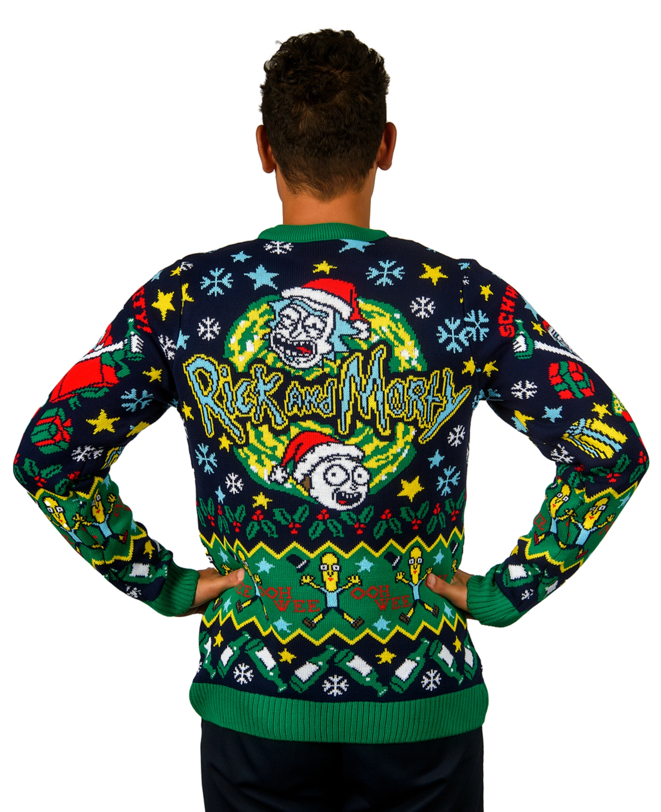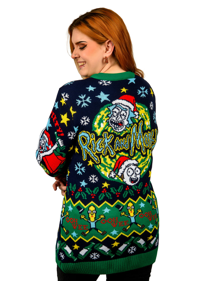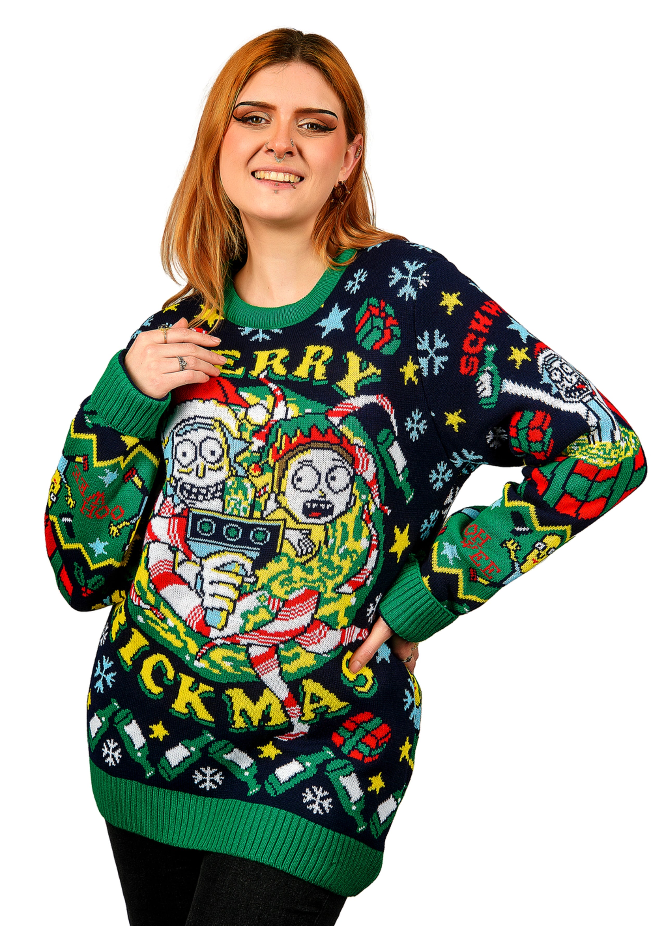 Ετοιμαστείτε για μια διυποδιαστασιακή εορταστική περιπέτεια με το Rick and Morty Christmas Jumper! Το πουλόβερ παρουσιάζει τον Rick και τον Morty να ξεπηδούν μέσα από μια πύλη, με την επιγραφή “Merry Rickmas”, προσφέροντας μια δυνατή δόση sci-fi χιούμορ και στυλ στις γιορτές σας.