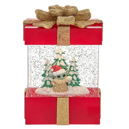 Αυτό το μουσικό κουτί με LED θερμού λευκού φωτισμού, που λειτουργεί με μπαταρίες, από την Kurt Adler είναι μια γοητευτική προσθήκη σε κάθε χριστουγεννιάτικη διακόσμηση. Το κουτί δώρου απεικονίζει τον The Child να στέκεται μπροστά σε χιονισμένα δέντρα κρατώντας ένα χιονόμπαλα. Το κόκκινο κουτί δώρου διακοσμείται με μια πράσινη γκλιτεράτη φιόγκο, προσδίδοντας μια εορταστική ατμόσφαιρα. Όταν ενεργοποιείται, παίζει μουσική, μια προβολή φωτός πέφτει στη σκηνή και άσπρο γκλίτερ περιστρέφεται δημιουργώντας ένα χιονισμένο τοπίο. Επίσημα αδειοδοτημένο προϊόν Star Wars™.