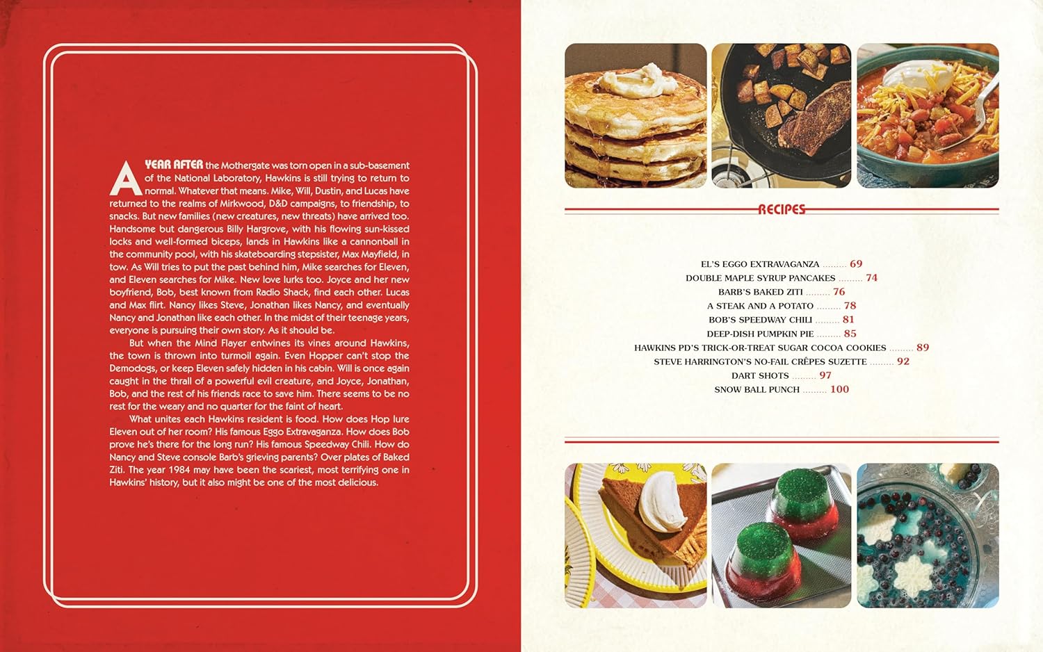 Καθίστε στο τραπέζι του Stranger Things και απολαύστε πάνω από εξήντα συνταγές από τους κατοίκους του Hawkins σε αυτό το πρώτο επίσημο βιβλίο μαγειρικής της δημοφιλούς σειράς του Netflix. Γιορτάστε τις γαστρονομικές προτιμήσεις των αγαπημένων σας χαρακτήρων με συνταγές που καλύπτουν φαγητό των ’80s στα mall, εβδομαδιαία γεύματα στο σπίτι των Wheeler ή τα καλύτερα σνακ για Dungeons & Dragons. Κάθε συνταγή συνδέεται με κάποιον χαρακτήρα ή γεγονός στο Hawkins ή στο Upside Down και συνοδεύεται από πρωτότυπη φωτογραφία φαγητού, στιγμιότυπα από τη σειρά και αγαπημένα quotes. Δοκιμάστε τα Demigorgonzola Cheese Balls, φτιάξτε το Hellfire Club Devil’s Food Cake του Eddie Munson ή μάθετε το μυστικό για το τέλειο tuna melt του Hopper. Με φωτογραφίες που ξαναφέρνουν τη δεκαετία του ’80 στη ζωή, αυτό το επίσημο βιβλίο μαγειρικής Stranger Things προσφέρει μια γεμάτη γεύση του Hawkins για τους fans με όρεξη.