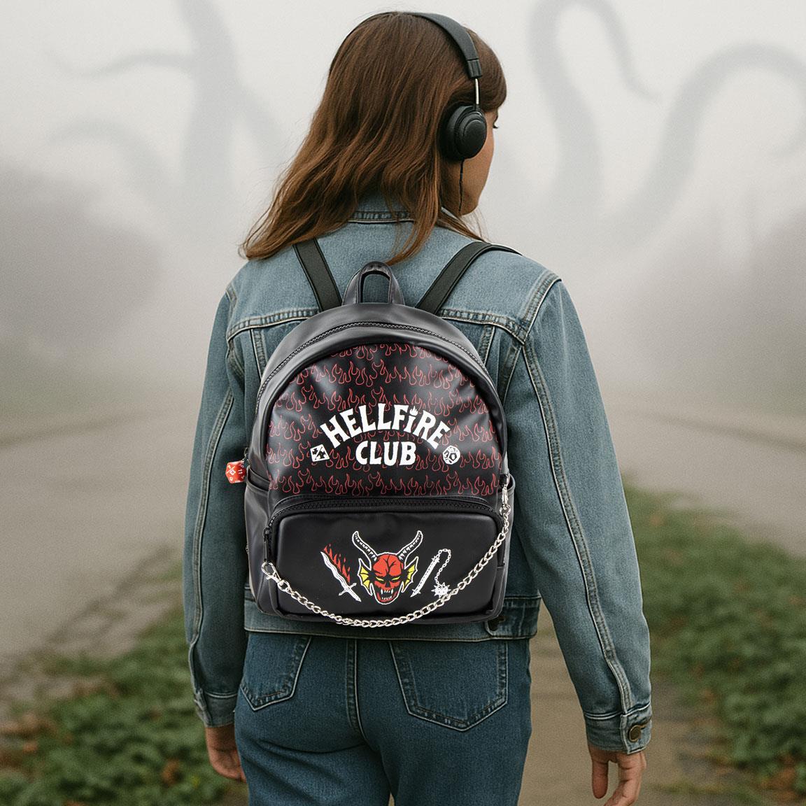 Αναβαθμίστε το στυλ σας με την Stranger Things Hellfire Club Faux Leather Backpack, ένα υψηλής ποιότητας, επίσημα αδειοδοτημένο mini backpack. Κατασκευασμένη από 100% PU δέρμα, προσφέρει ανθεκτικότητα και μοντέρνα αισθητική σε ένα compact μέγεθος 23 x 27 x 11 εκ..