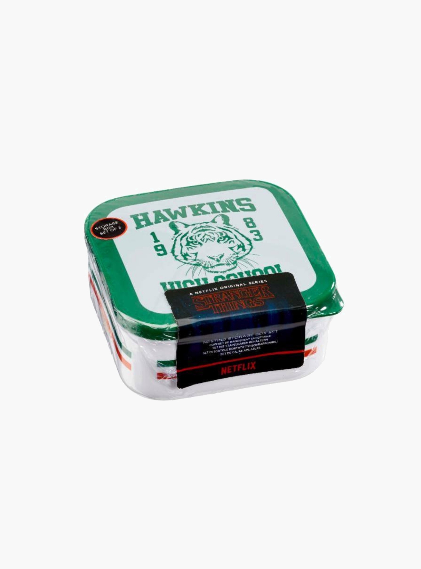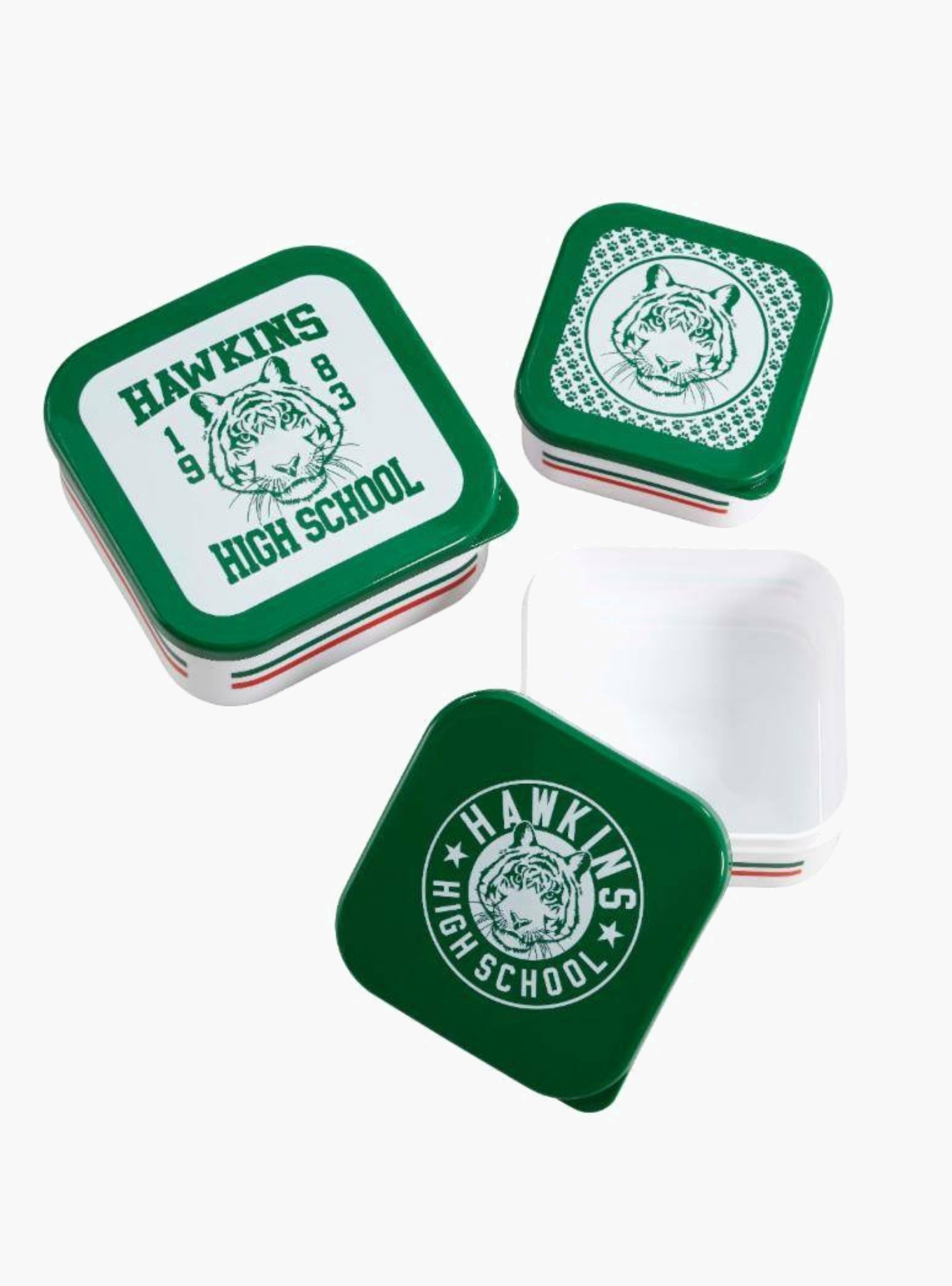 Τα τρία αυτά κουτιά κολατσιού έχουν διαφορετικά μεγέθη και μπορούν να αποθηκευτούν το ένα μέσα στο άλλο, σαν Ρωσικές κούκλες. Έχουν πραγματικά πρακτικό σχέδιο, εξαιρετική ποιότητα τόσο στα εκτυπωμένα σχέδια όσο και στα υλικά, με υπέροχες τελικές πινελιές. Το πιο εντυπωσιακό, όμως, είναι το σχέδιο τους, το οποίο απεικονίζει το έμβλημα του Hawkins High School, του σχολείου όπου είναι μαθητές οι πρωταγωνιστές της σειράς.