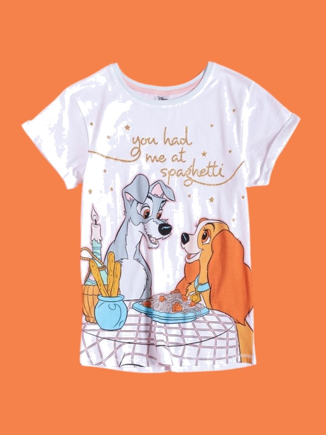 - Design featuring the iconic dinner scene from Lady and the Tramp