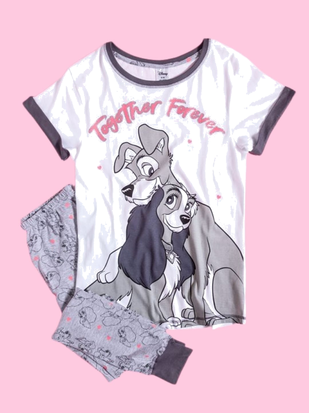 Fall in love with Disney's Lady And The Tramp all over again when you wear this super cute pj set! The perfect tribute to the sweetest tale of puppy love you ever did hear, we adore the all over print bottoms and the Together Forever slogan. - Officially licensed - 100% cotton - Imported