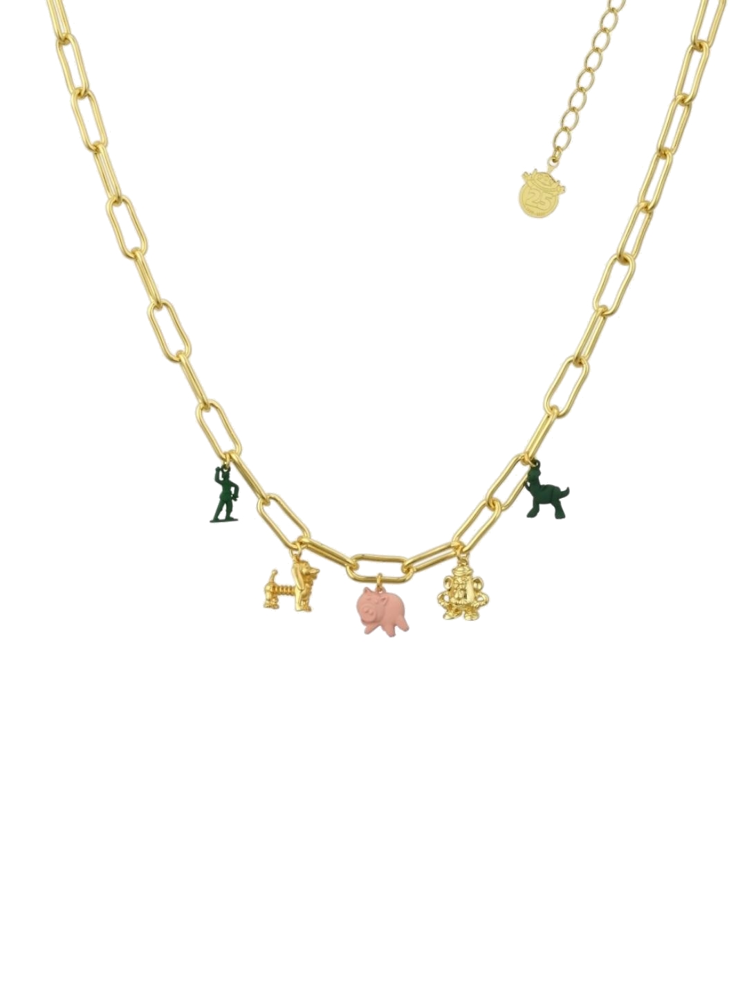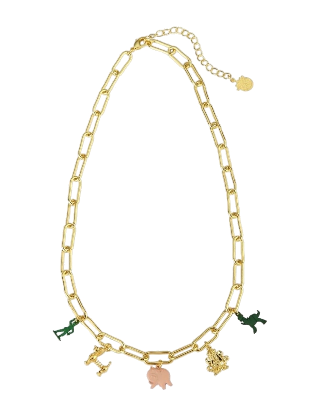 This on trend choker style 14kt gold-plated necklace from Couture Kingdom features a host of Toy Story favourites from Andy's toy room! Including Slinky Dog, Green Army Men, Hamm, Mr. Potato Head and Rex. Have fun with your nostalgia while maintaining your fashion style. - Officially licensed - Measures 40cm + 7cm - Charm lengths 15mm - Imported