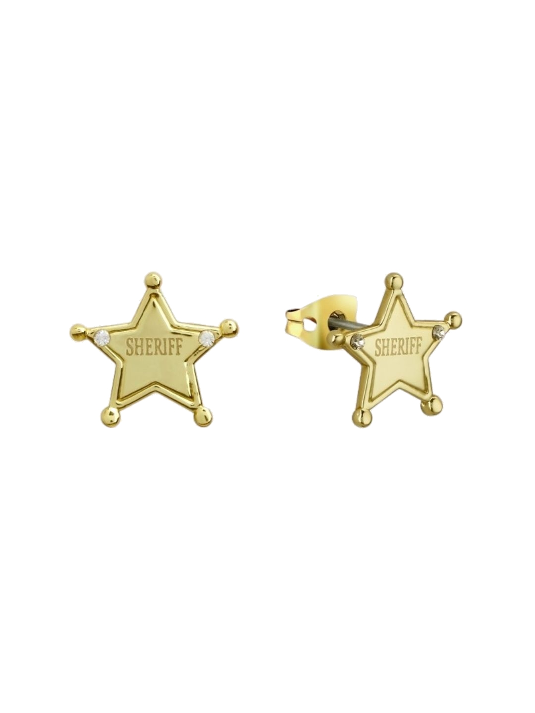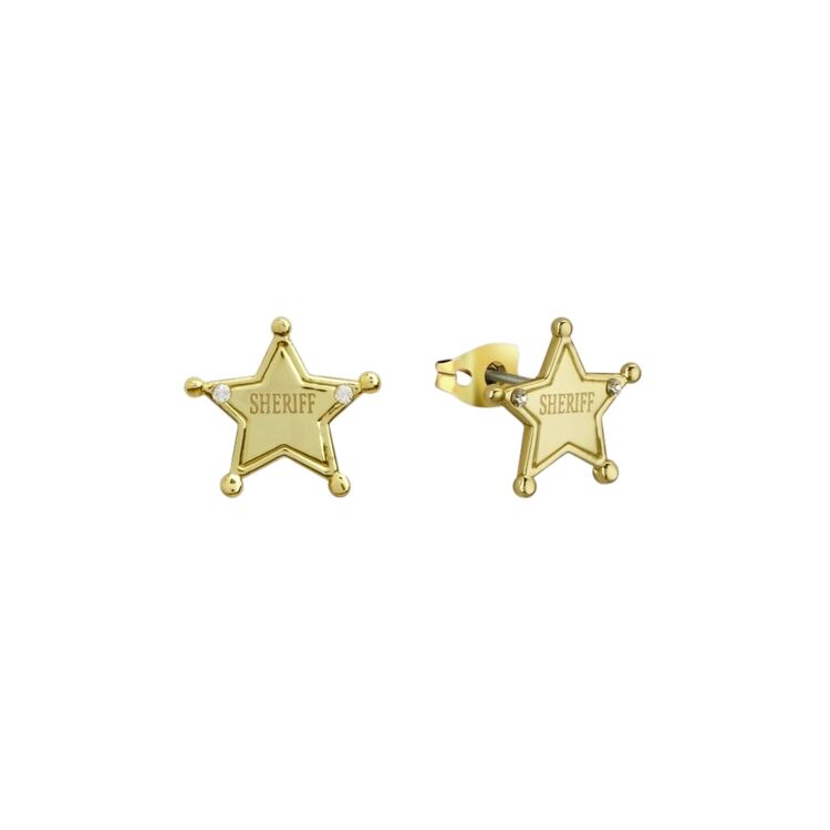 Everyone's favourite Sheriff is celebrated with these sweet Sheriff badge 14kt gold-plated stud earrings from Couture Kingdom. They feature two sparkling crystals to take these little stars to the next level. Perfect for fans of Toy Story, both young and old. - Officially licensed - Earrings measure 12mm - Imported