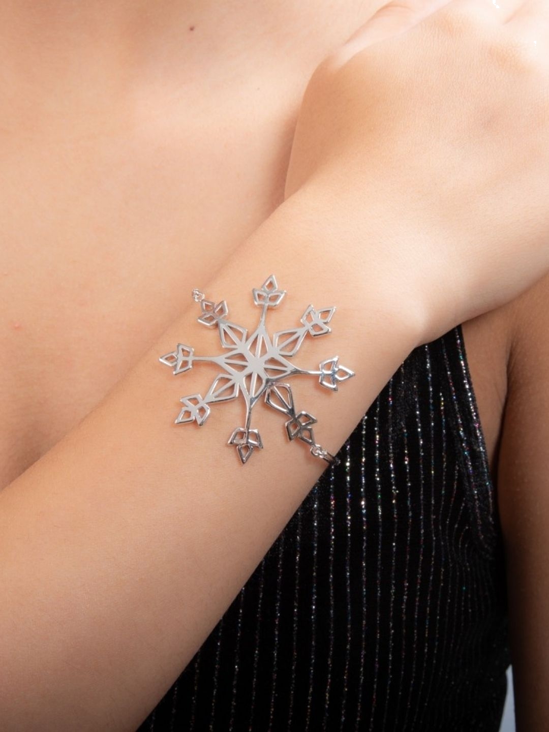 Wear as reminder to always be you, our Couture Kingdom iconic snowflake statement 14kt white gold-plated bracelet is crafted in a high shine finish allowing Frozen fans to channel their inner ice queen! - Officially licensed - Snowflake diameter: 50mm. - Adjustable length of 15-18cm. - Feature a little snowflake charm by the clasp. - Imported
