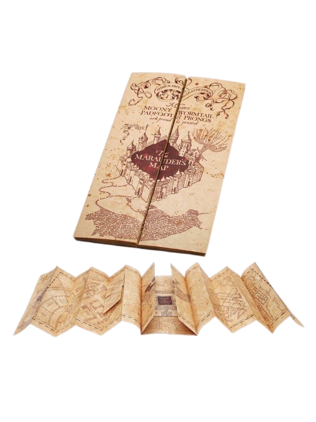The Marauder’s Map replica from the Harry Potter universe is an accurate reproduction of the iconic map that reveals Hogwarts’ secrets through folds and flaps concealing hidden details. First seen in the film Harry Potter and the Prisoner of Azkaban (2004), the map is gifted to Harry by the Weasley twins. The map can be revealed only by saying "I solemnly swear I am up to no good" and can be wiped clean with "Mischief managed". When fully opened, the map measures approximately 39 cm x 183 cm, offering an impressive display size for collectors and fans alike.