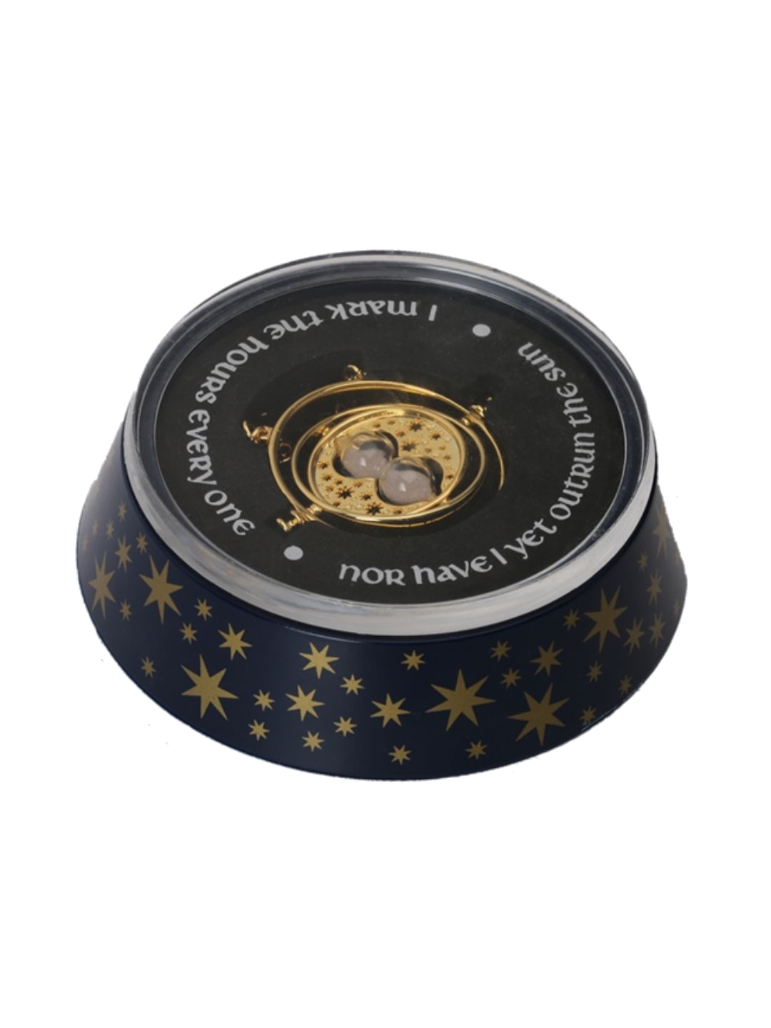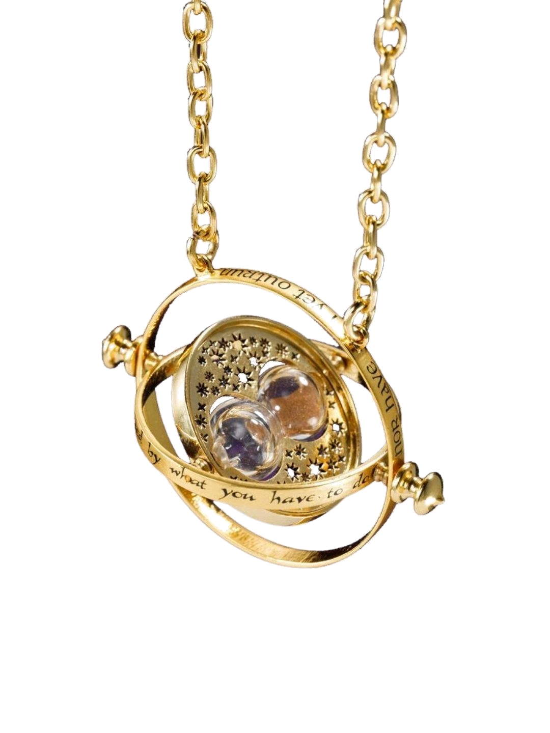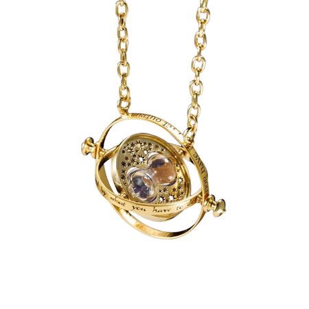 An authentic recreation of Hermione's Time Turner. Centred with a working miniature hourglass with inner rotating rings. It measures 5 cm. in diameter with a 76 cm. chain. Plated in 24 karat gold and comes in a collector box. - Officially licensed - Imported