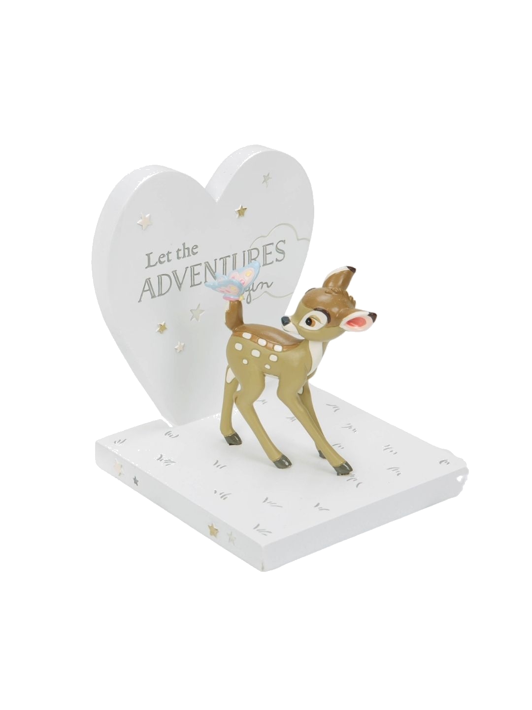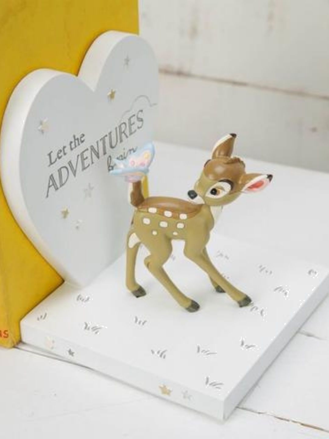 Bring Disney magic to a child's nursery or bedroom with these enchanting 3D Bambi bookends from the Magical Beginnings collection. Crafted from handmade, painted clay moulds, these bookends feature soothing white and soft grey coloured stands. Atop the stands sit beautifully decorated Bambi characters, with heart-shaped braces behind them that display the sentiment “Let The Adventures Begin” and glistening metallic stars. These bookends come in a bespoke packaging, perfect for gifting or adding to your collection.