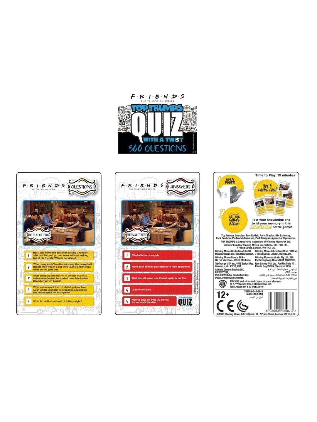 Think you know Friends? Well, now's the time to test your knowledge with Top Trumps Quiz with a Twist! 500 questions and a unique form of gameplay that will test your mind on the world's greatest television series! - Officially licensed - 500 questions - Suitable Age: 6+ - Number of Players: 2+ - English - Imported