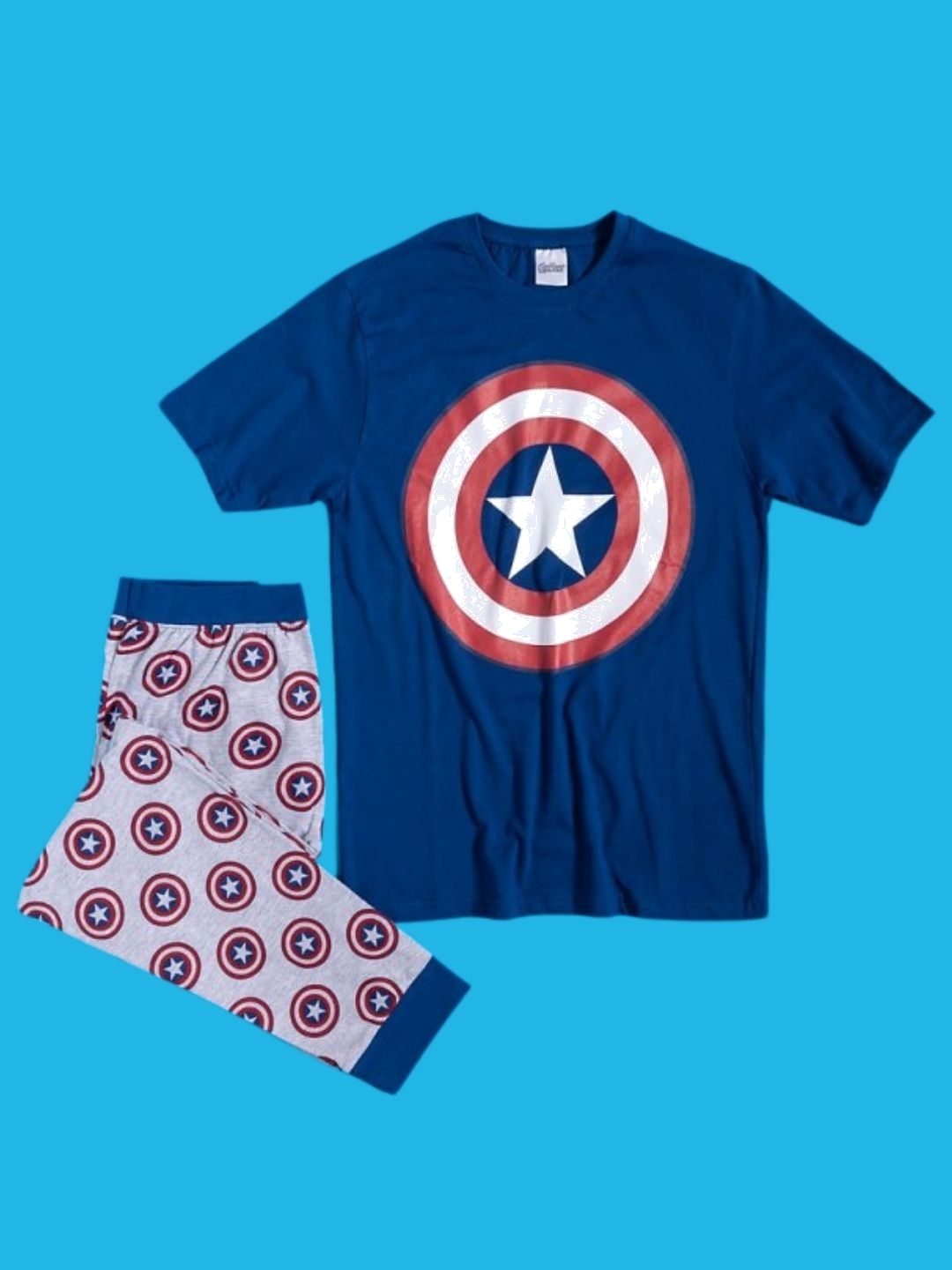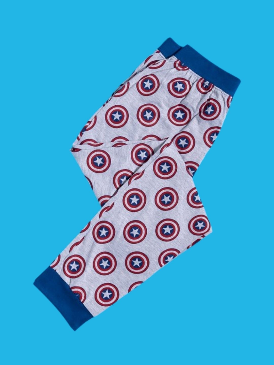 Keep your lounging game SUPER cool in these ace Captain America PJs featuring the classic shield logo on the top and bottoms. - Officially licensed - 100% Cotton - Imported