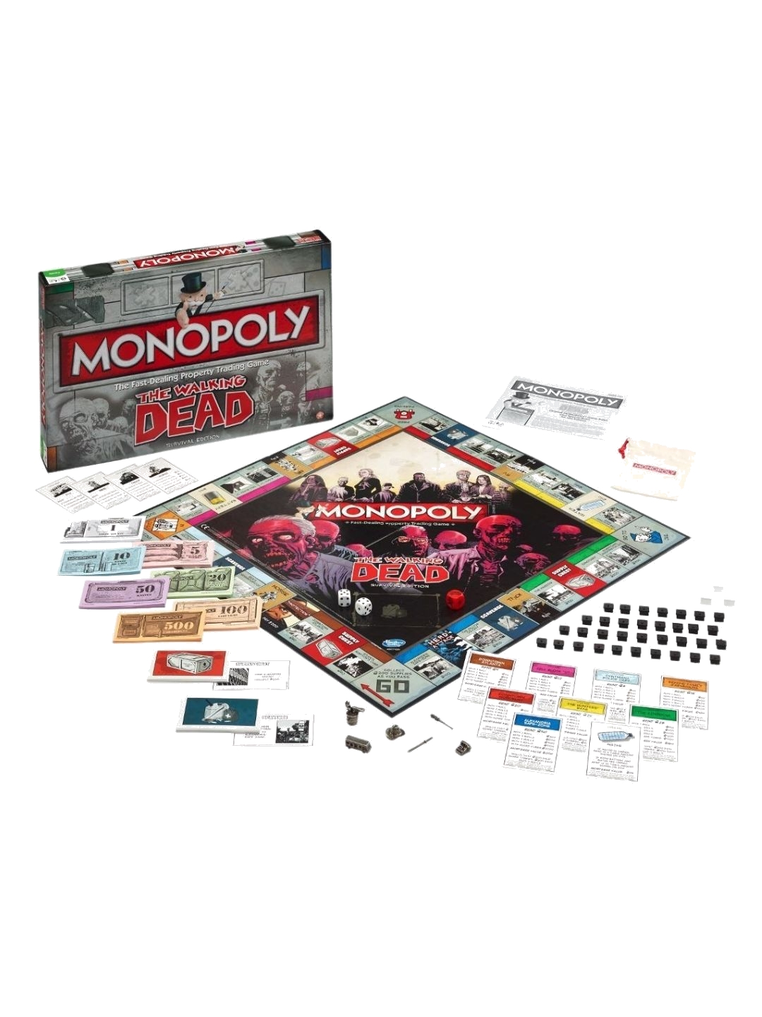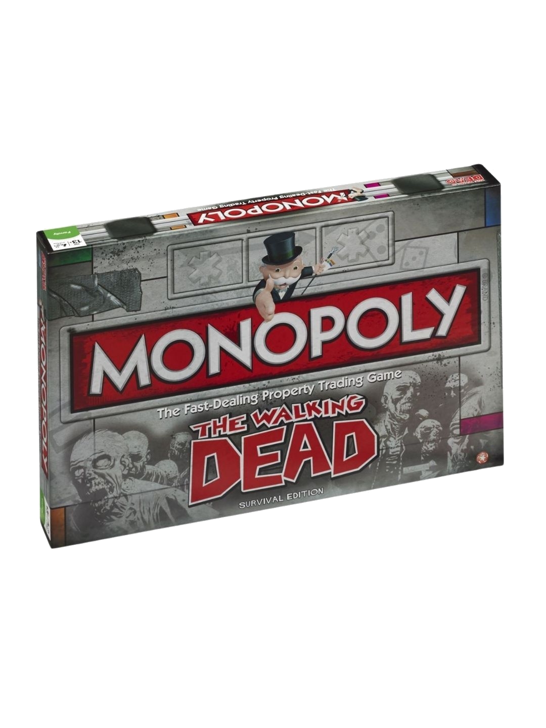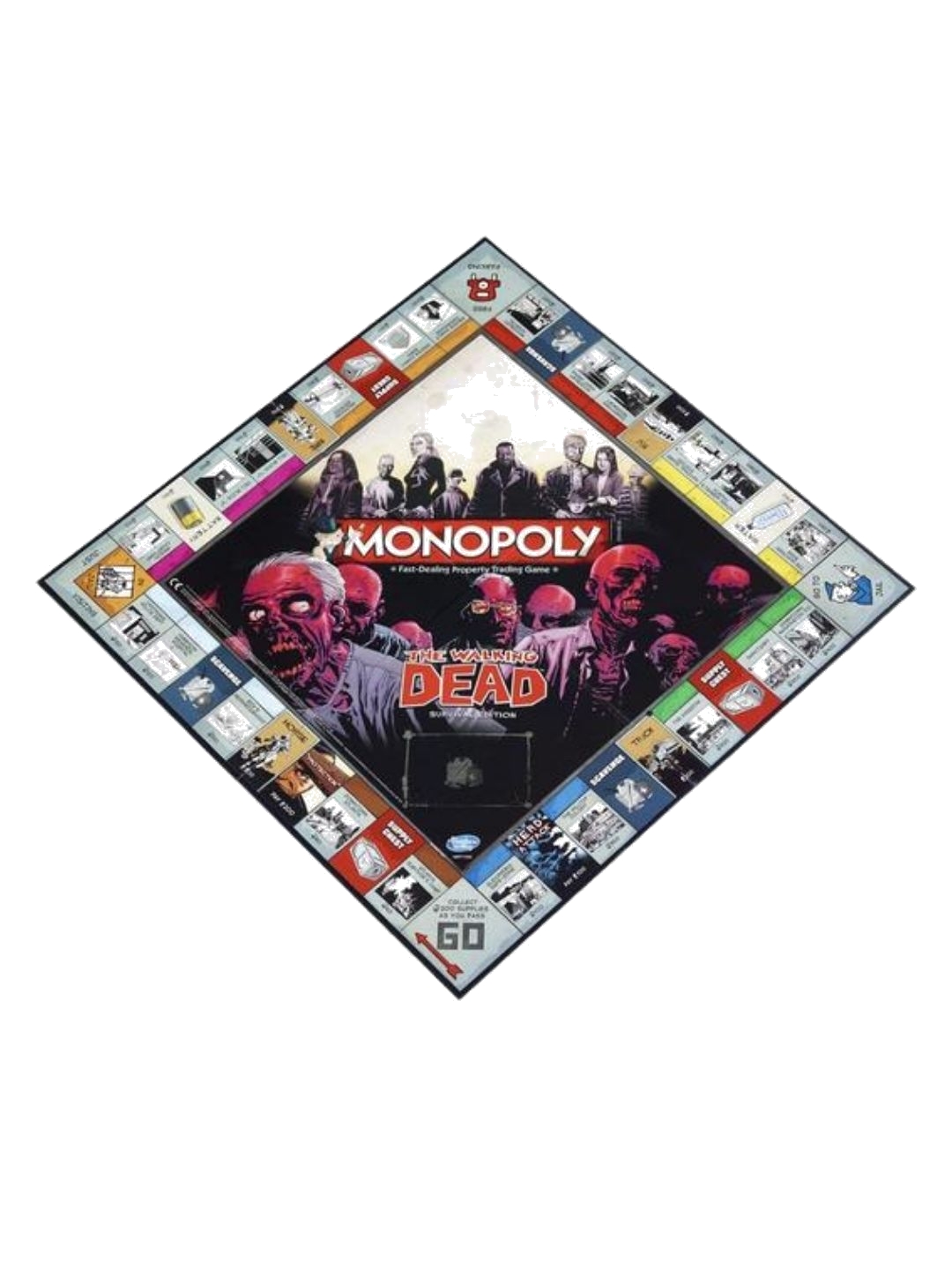 Despite its post-apocalyptic setting, The Walking Dead Comic Survival Edition Monopoly Game delivers classic Monopoly wheeling and dealing game play. Players vie for, and must then fortify, the prime real estate and resources that will sustain their lives. Includes 6 undead'-themed tokens! - Officially licensed - Age: 8+ - Number of Players: 2+ - English Version - Imported
