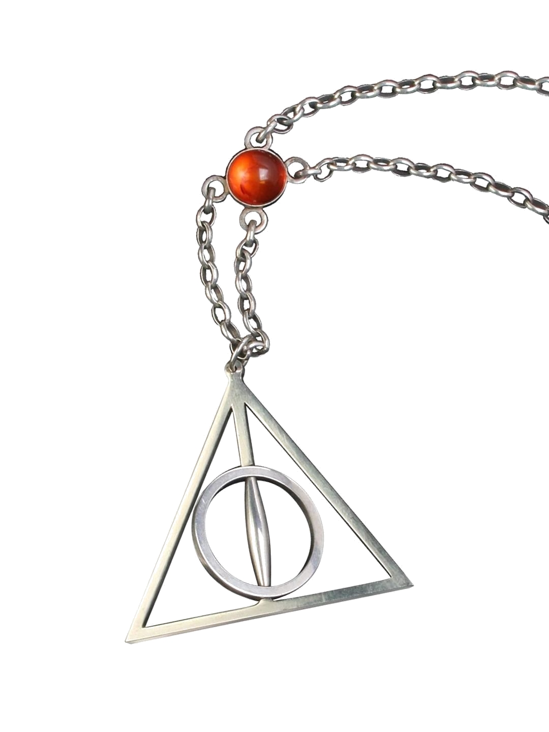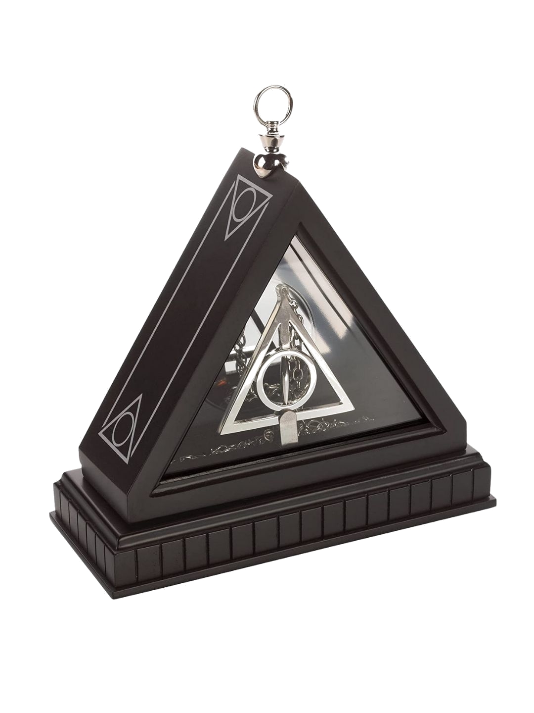 This beautiful necklace depicts the symbol of the mysterious Deathly Hallows, worn around Xenophilius Lovegood’s neck at the wedding of Bill and Fleur Weasley! - Officially licensed - Pendant measures approx. 5cm - Chain measures 51cm - Diecast zinc alloy, metal chain - Wooden triangular display case measures approx 15cm in height - Imported