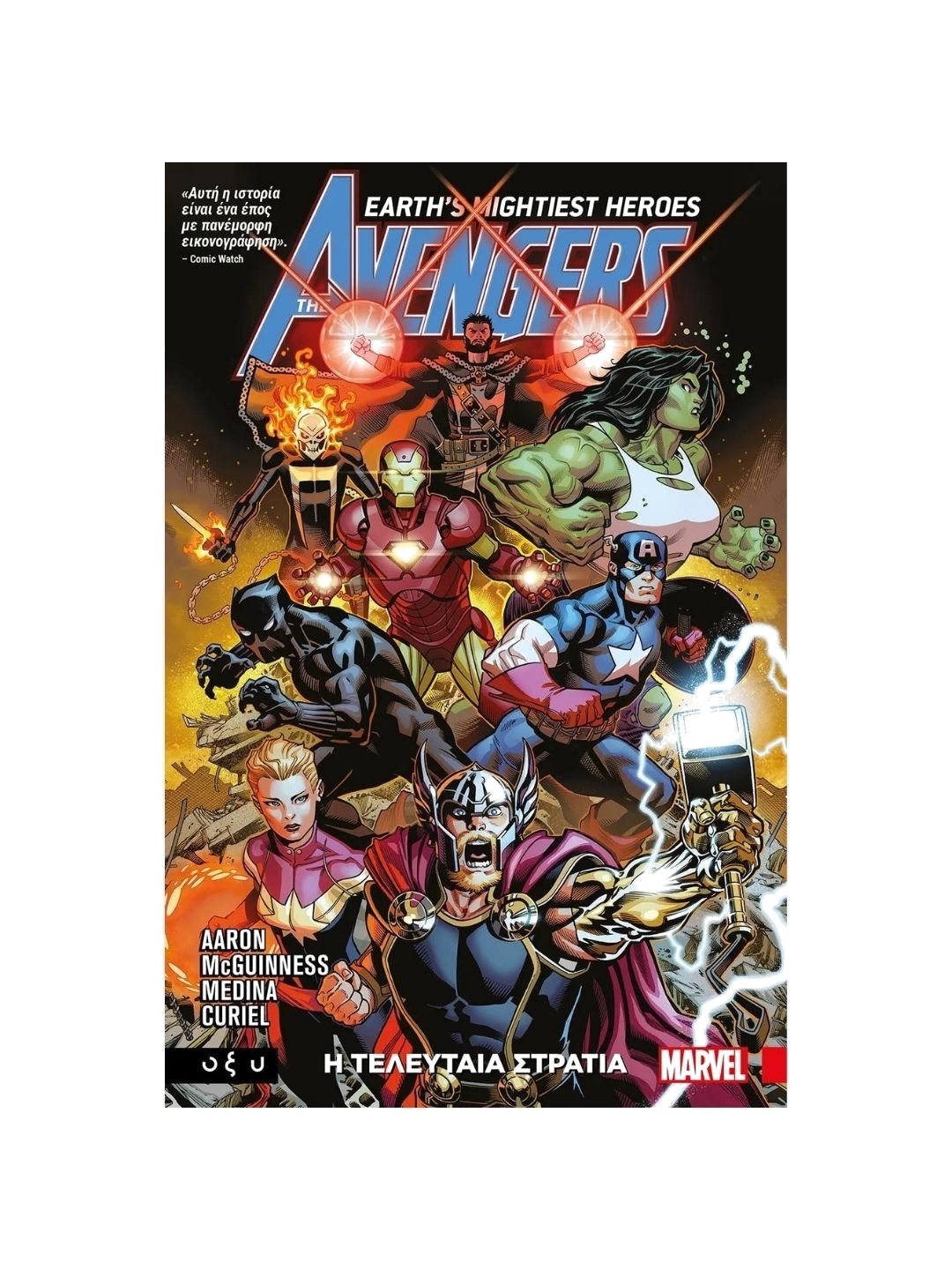 A new era for Earth's Mightiest Heroes! Steve Rogers. Tony Stark. Thor Odinson. The big three are reunited at last! And just in time to save the world from total annihilation at the hands of their most powerful enemies yet - the 2,000-foot-tall space gods known as the Celestials! Behold the coming of the Final Host! But who will answer the call as a new team of Avengers assemble? Hint: one of them has a fl aming skull. As Black Panther and Doctor Strange battle for their lives deep within the earth, Captain Marvel faces death and destruction raining down from the skies...and what about the Savage Hulk? Plus, no gathering of Avengers would be complete without a certain Prince of Lies! But what world-shaking connection exists between the Dark Celestials and Odin's ancient band of Prehistoric Avengers? - Officially licensed - Paperback | 160 pages - Publisher Marvel Comics, ΟΞΥ - Author Jason Aaron , Illustrated by Ed McGuinness - 168 x 259 x 5.08mm - Greek - Imported