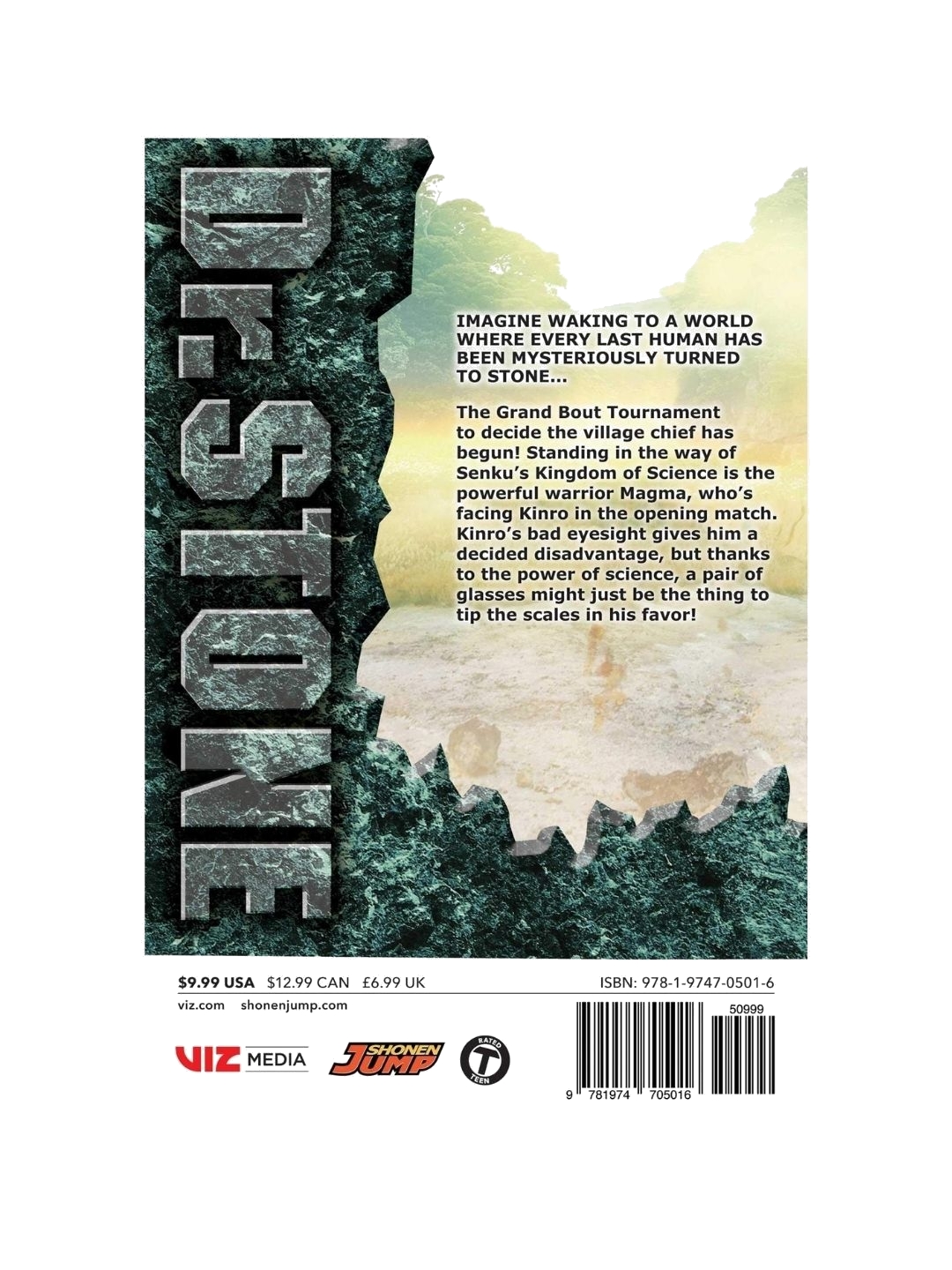 Volume 5 of the famous manga series Dr. Stone! Imagine waking to a world where every last human has been mysteriously turned to stone... One fateful day, all of humanity turned to stone. Many millennia later, Taiju frees himself from the petrification and finds himself surrounded by statues. The situation looks grim-until he runs into his science-loving friend Senku! Together they plan to restart civilization with the power of science! "The Grand Bout has begun! For Senku's Kingdom of Science to succeed, they need to win, but standing in their way is the ferocious and powerful Magma! Kinro's first up against him, but his bad eyesight severely handicaps him. A pair of "science eyes" might be just the thing to turn this battle around! " - Paperback - Publisher Viz Media, Subs. of Shogakukan Inc - Author Riichiro Inagaki , Illustrated by Boichi