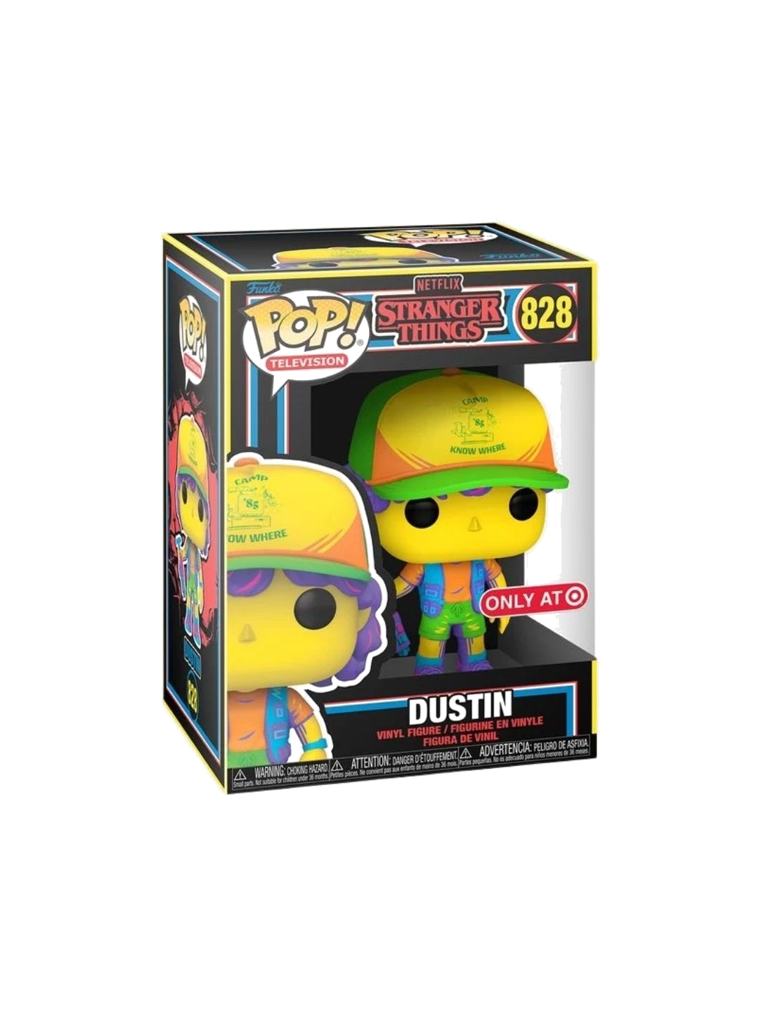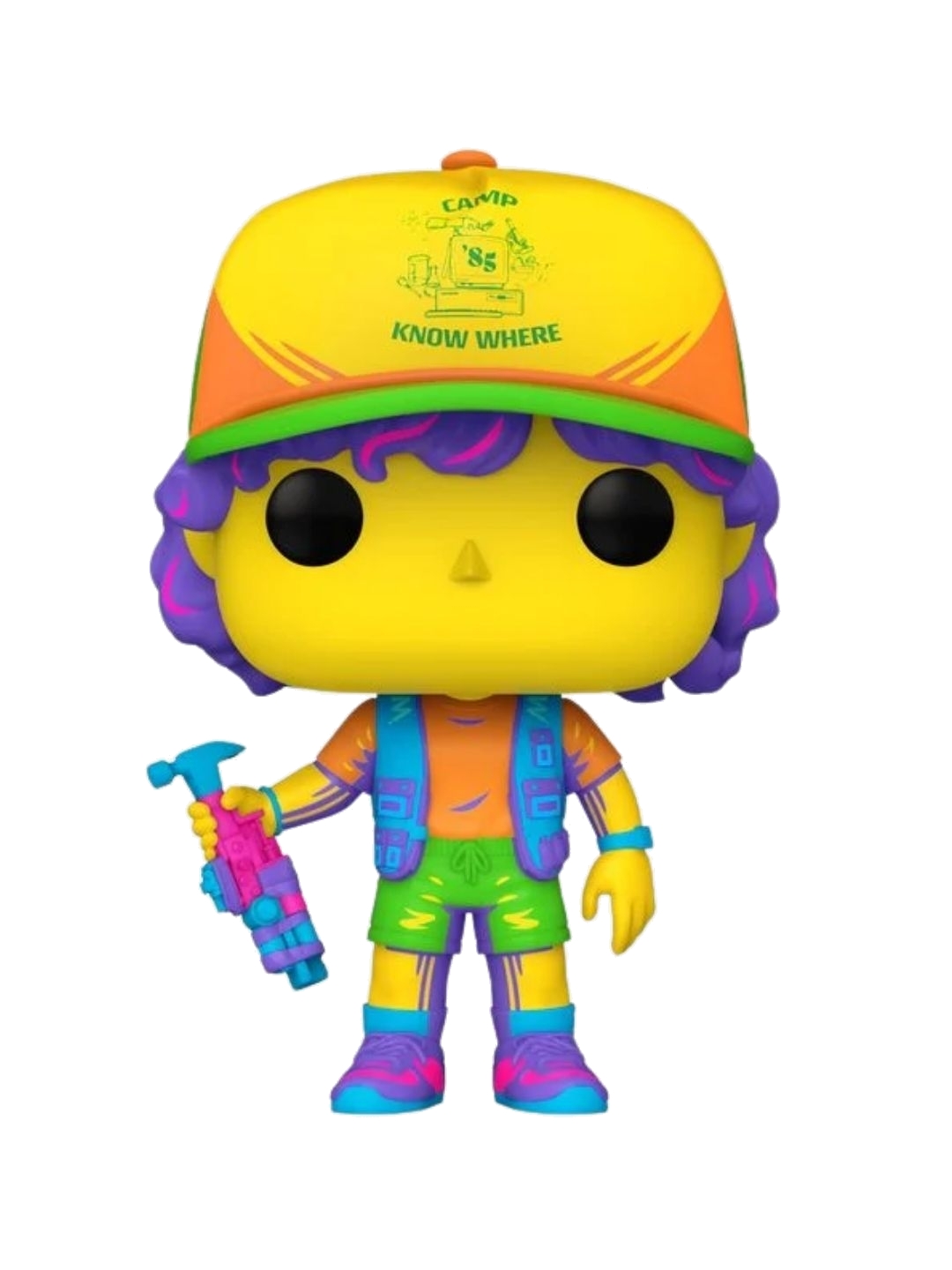 Return to 1985 and Camp Know Where with this Funko Pop! TV Stranger Things Dustin Blacklight Pop! A science wiz Dustin creates useful and versatile inventions at camp. And now he also glows in the dark in this blacklight Pop! version, where he holds up one of his inventions, The Slammer, for all to see. He's also wearing his Camp Know Where baseball cap. This collectible vinyl figure is a special addition for any fan of the show and will stand out in your collection.