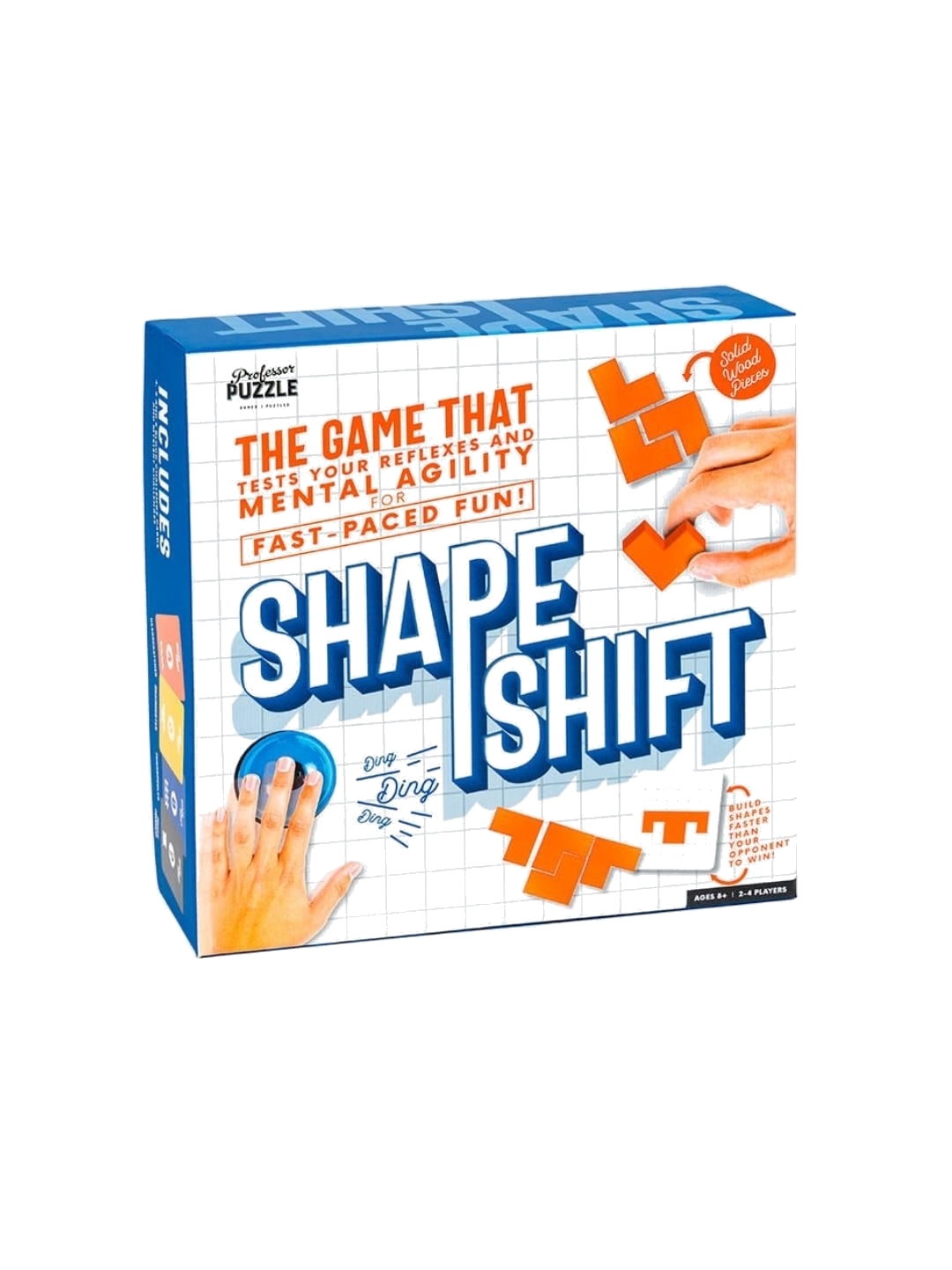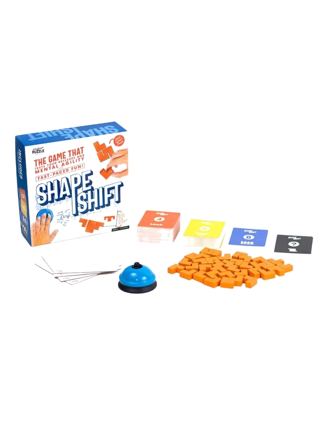 Shape Shift is a fun and educational board game that develops players’ combinational, spatial, and logical skills. Participants create imaginative shapes using identical wooden pieces on a grid-based board. Challenges come in varying difficulty levels, and players compete to be the fastest in the round. The first to complete the shape correctly hits the bell to win the corresponding card and round. Shape Shift combines entertainment, strategy, and educational value in every game.
