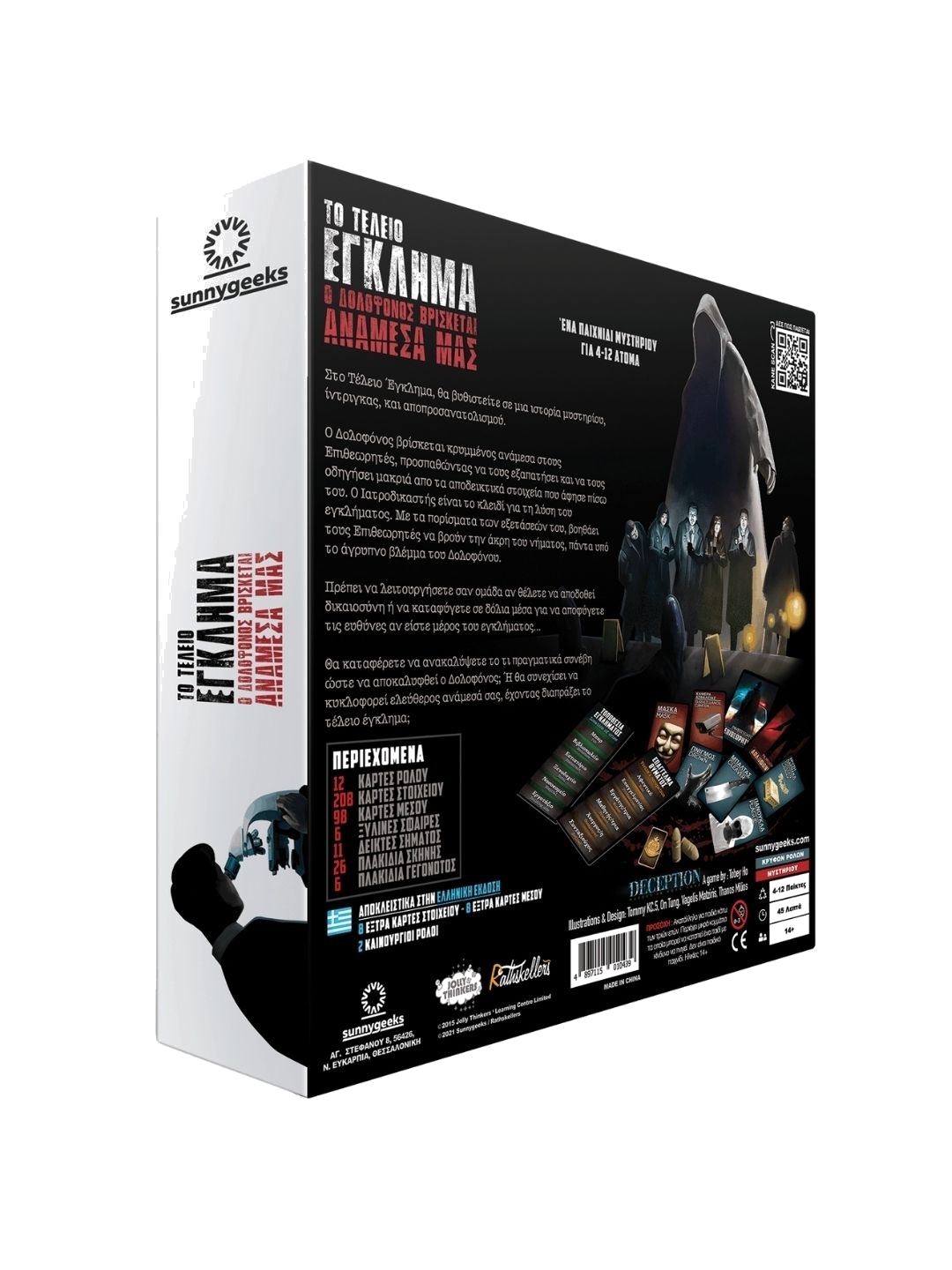 Στο Τέλειο Έγκλημα, θα βυθιστείτε σε μια ιστορία μυστηρίου, ίντριγκας, και αποπροσανατολισμού. Ο Δολοφόνος βρίσκεται κρυμμένος ανάμεσα στους Επιθεωρητές, προσπαθώντας να τους εξαπατήσει και να τους οδηγήσει μακριά απο τα αποδεικτικά στοιχεία που άφησε πίσω του. Ο Ιατροδικαστής είναι το κλειδί για τη λύση του εγκλήματος. Με τα πορίσματα των εξετάσεών του, βοηθάει τους Επιθεωρητές να βρουν την άκρη του νήματος, πάντα υπό το άγρυπνο βλέμμα του Δολοφόνου. Πρέπει να λειτουργήσετε σαν ομάδα αν θέλετε να αποδοθεί δικαιοσύνη ή να καταφύγετε σε δόλια μέσα για να αποφύγετε τις ευθύνες αν είστε μέρος του εγκλήματος… Θα καταφέρετε να ανακαλύψετε το τι πραγματικά συνέβη ώστε να αποκαλυφθεί ο Δολοφόνος; Ή θα συνεχίσει να κυκλοφορεί ελεύθερος ανάμεσά σας, έχοντας διαπράξει το τέλειο έγκλημα; - Ηλικία 14+ - Παίκτες: 4-12 - Εκδότης SunnyGeeks - Ελληνικά - Imported