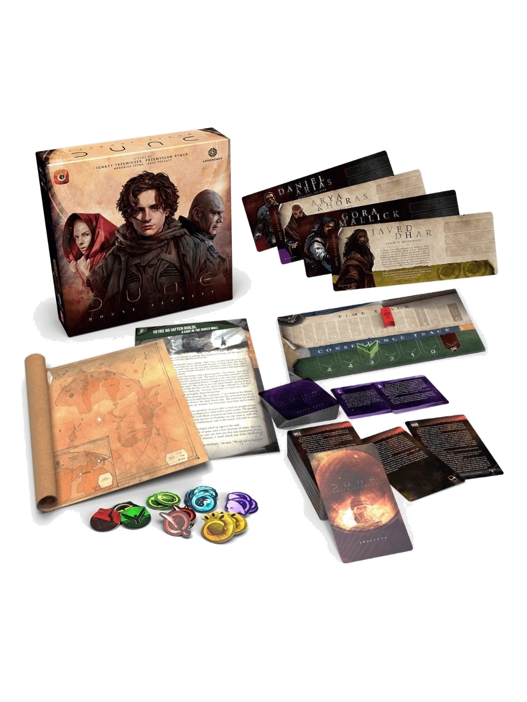 Αυτό το εκπληκτικό επιτραπέζιο παιχνίδι είναι το τέλειο δώρο για κάθε θαυμαστή του Dune! Ανακάλυψε τώρα πληθώρα ειδών από τις αγαπημένες σου σειρές μόνο στο Nerdom! "In Dune: House Secrets, players take on the roles of rebels who must solve a series of challenging missions with a finite amount of time and resources. Players cooperatively make decisions on how to progress the story, as they explore different regions of the world, follow leads, leverage allies, and overcome opposition of all kinds. During gameplay, players utilize a variety of physical and digital game components to steer the narrative in fun and surprising directions – a deck of cards with essential clues and plot twists, a dozen physical handouts, and a dedicated website with assorted videos and additional resources – for a truly immersive game experience." - Επίσημο προϊόν - 1-4 players - Age 14+ - English
