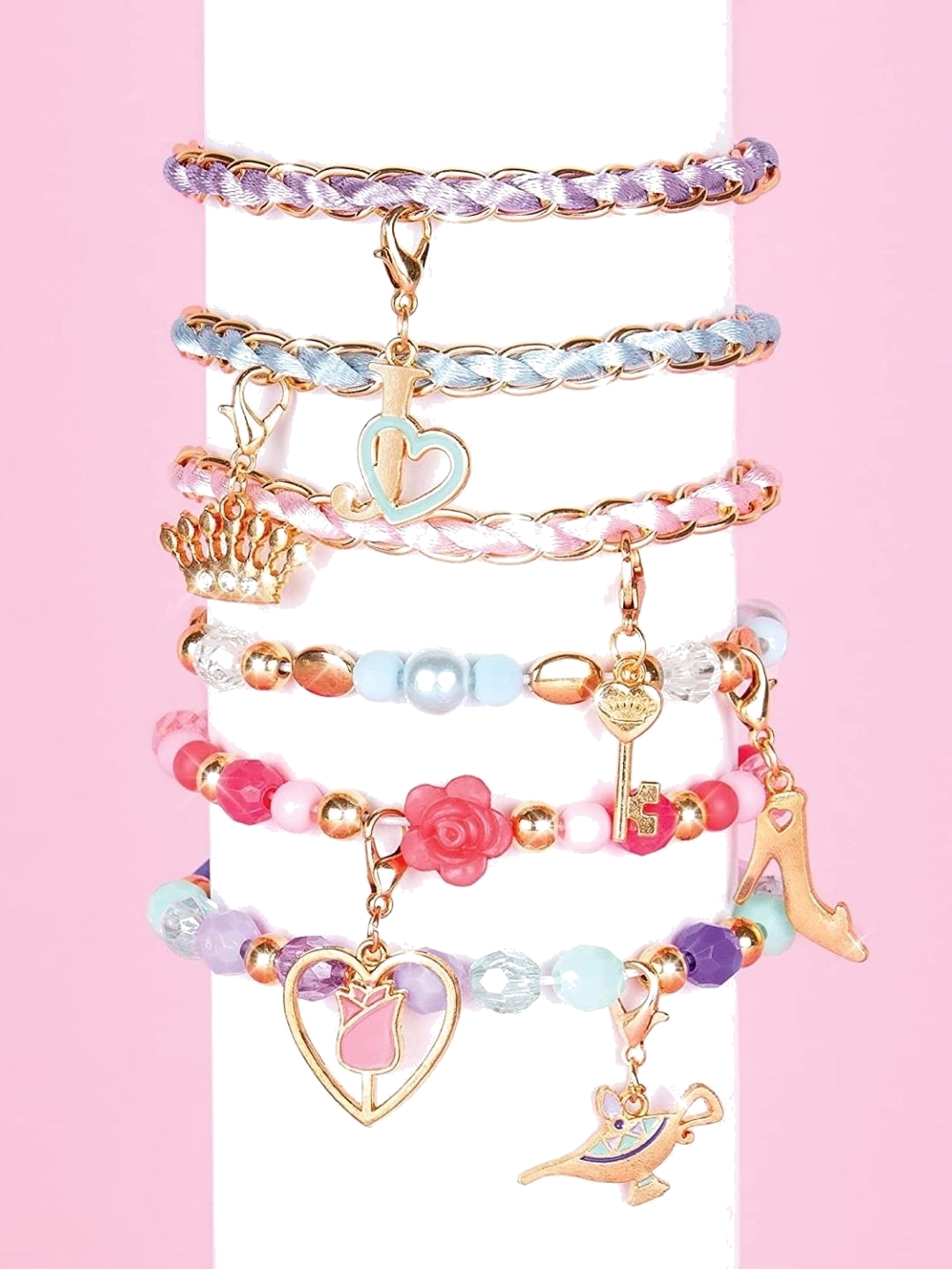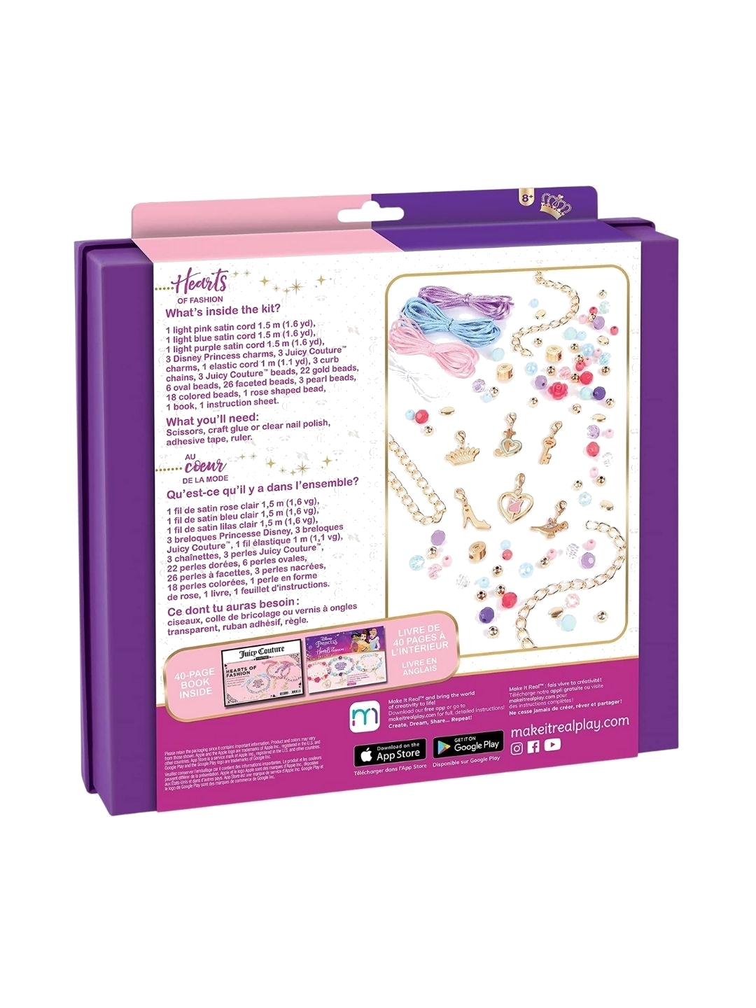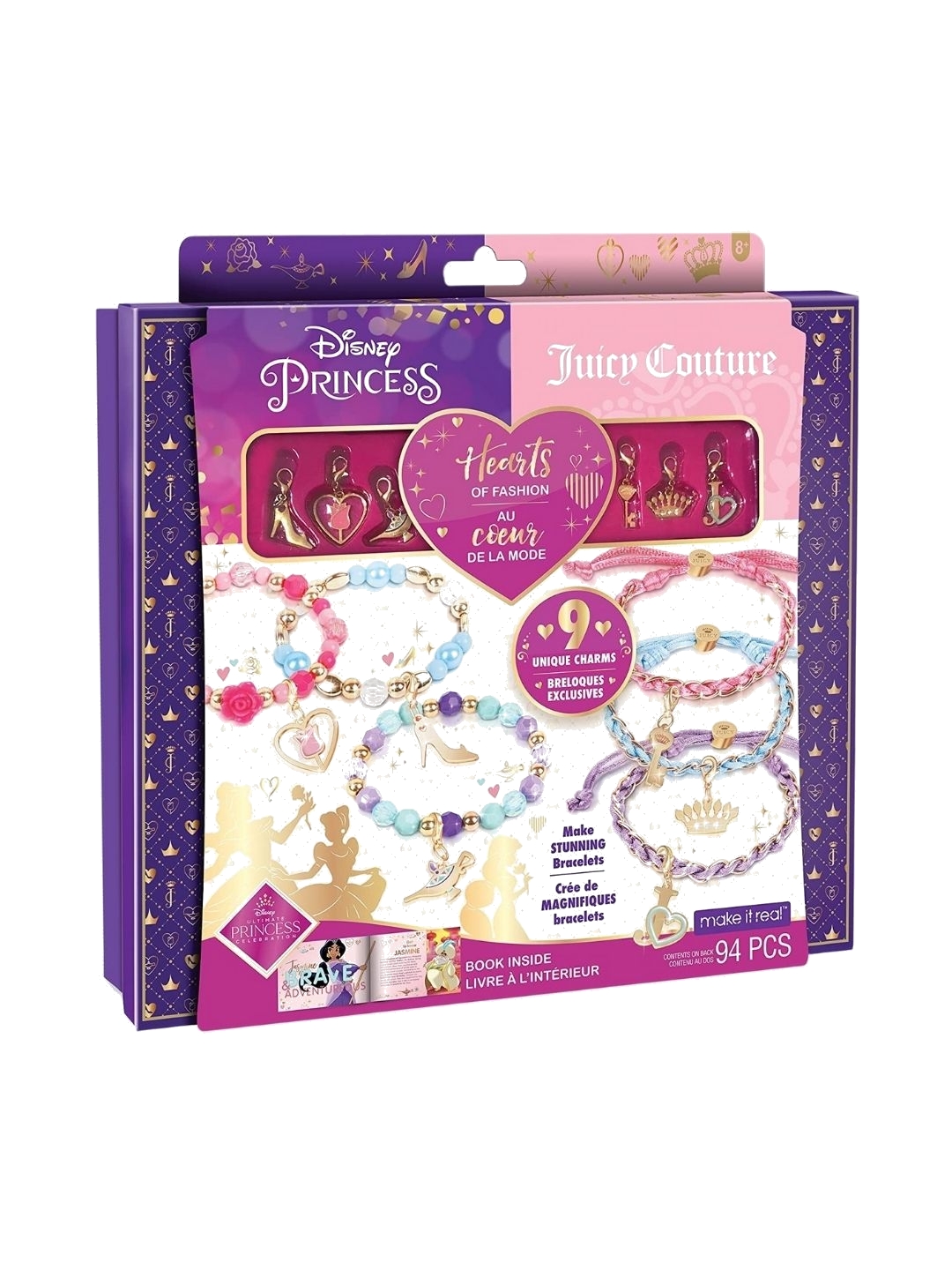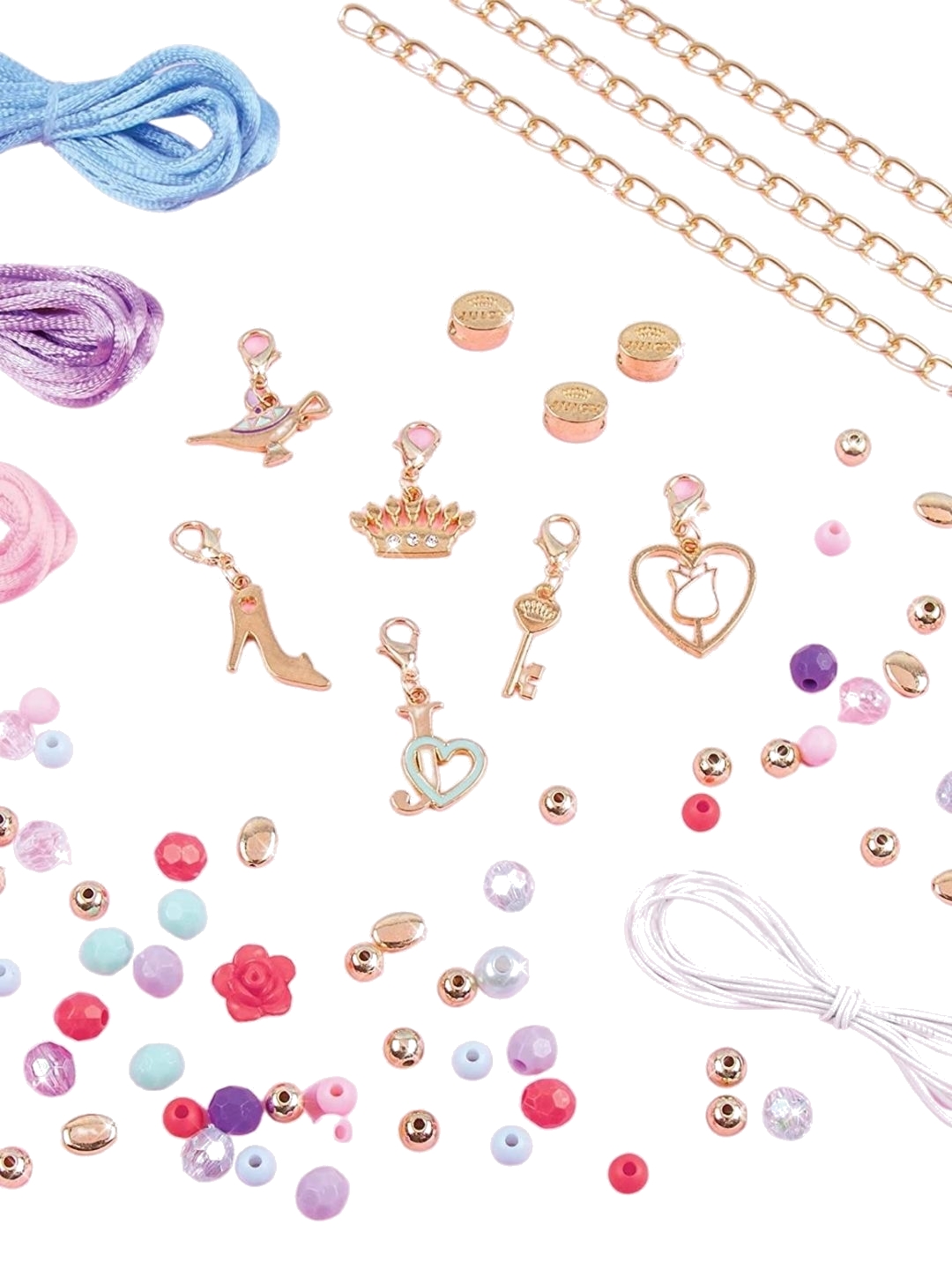 Two favorite brands come together to form one awesome kit in the Disney Princess Juicy Couture Hearts of Fashion. This DIY set invites designers to make 6 bracelets featuring images from fashion label Juicy Couture™ along with Belle, Cinderella, and Jasmine. - Officially licensed Kit includes: - 1 light pink satin cord—1.5 m (1.6 yd) - 1 light blue satin cord—1.5 m (1.6 yd) - 1 light purple satin cord—1.5 m (1.6 yd) - 3 Disney Princess charms - 3 Juicy Couture™ charms - 1 elastic cord—1 m (1.1 yd) - 3 curb chains - 3 Juicy Couture™ beads - 22 gold beads - 6 oval beads - 26 faceted beads - 3 pearl beads - 18 colored beads - 2 rose shaped beads - 1 book - 1 instruction sheet