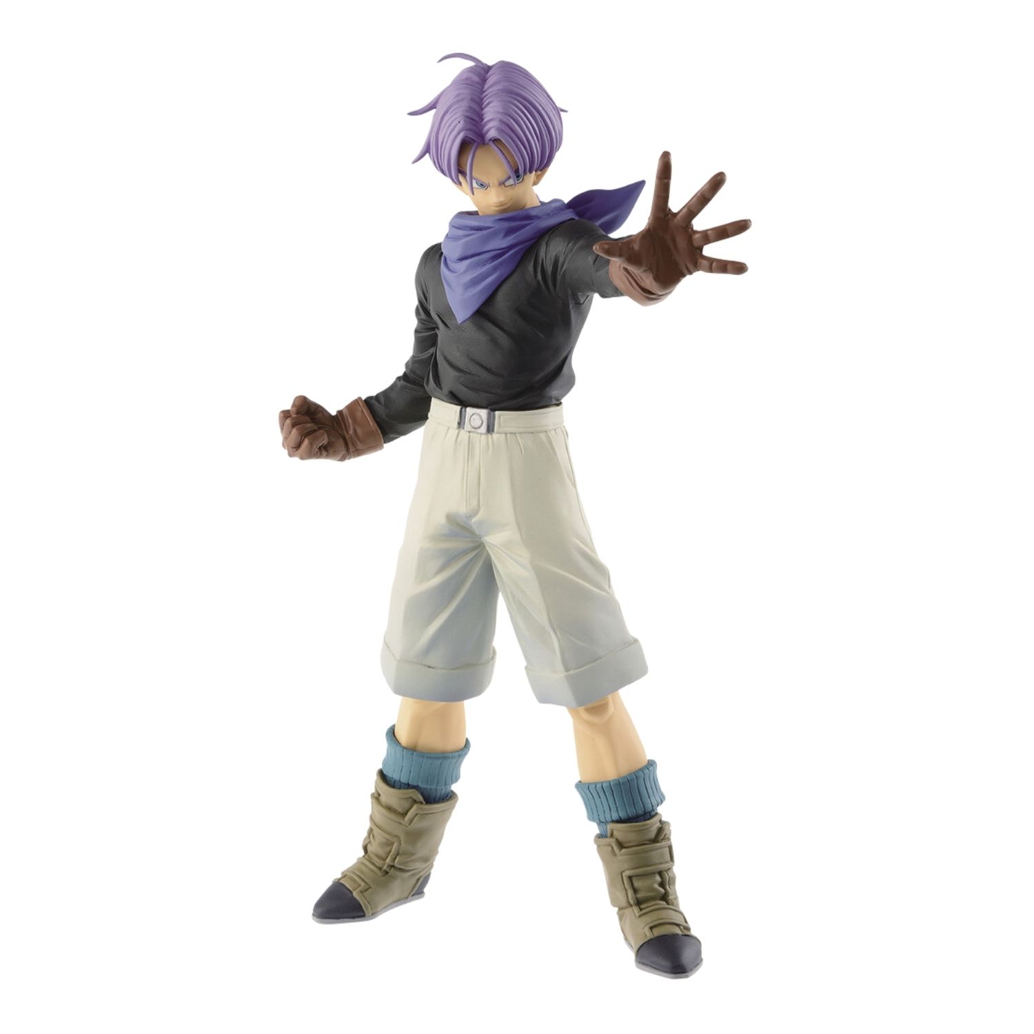 From the Ultimate Soldiers series by Banpresto, the figure of Trunks is here! Dressed in his black shirt, tan pants, and purple scarf, Trunks stands at around 19 cm, ready for battle. This figure captures Trunks with amazing detail, perfect for any Dragon Ball GT fan’s collection.