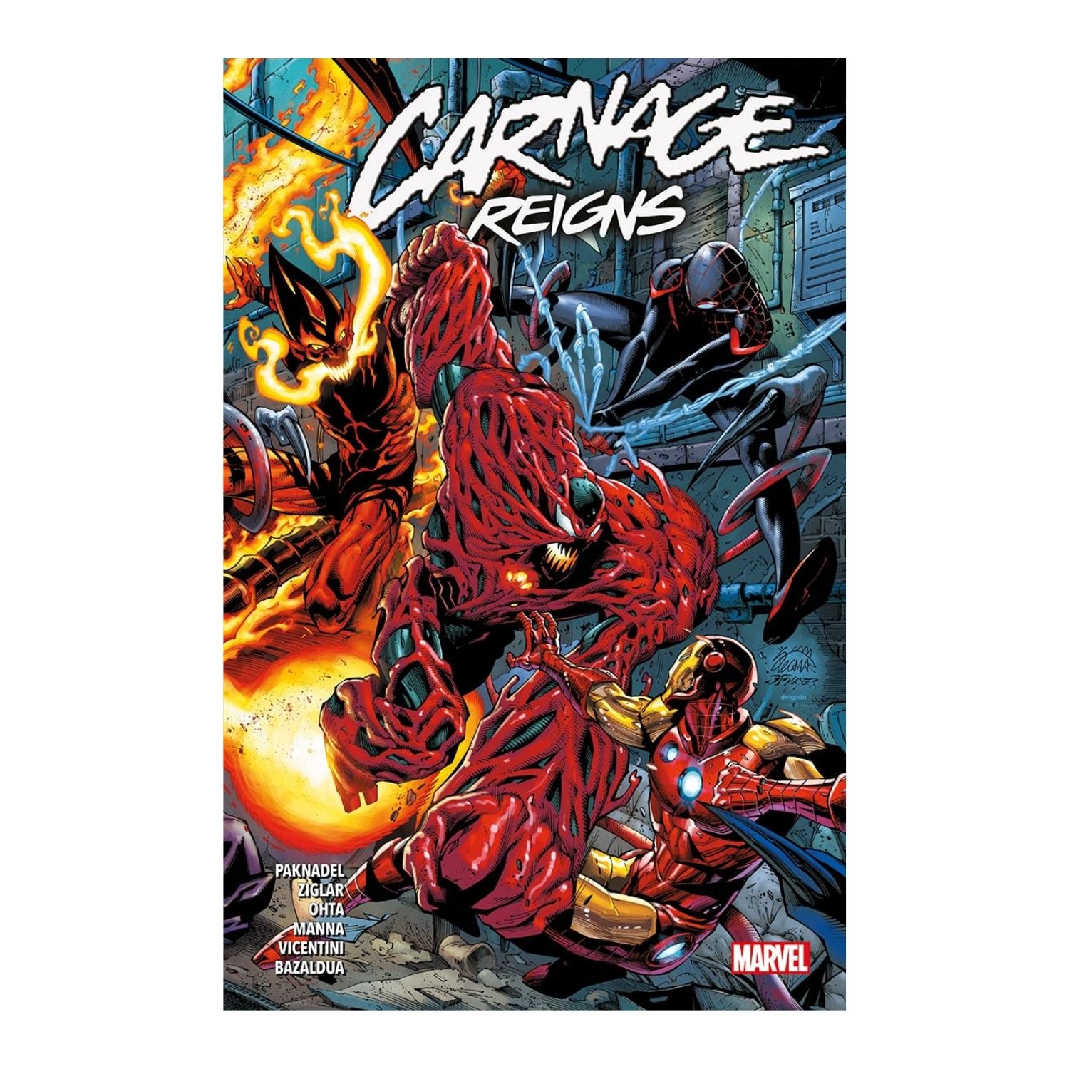 Carnage vs. Miles Morales! Cletus Kasady is back - and badder than ever. With his soul trapped inside the Extrembiote Armor created by Tony Stark during KING IN BLACK, Cletus now has the means to level an untold amount of chaos on New York City - and the entire Marvel Universe! But like any good Tony Stark invention, the Extremis coursing through Cletus' symbiotic veins needs power - and that means Cletus is hungry. Good thing Brooklyn's very own Spider-Man is there to stand in his way! If Miles survives their first encounter, that is. But where will the young would-be hero known as the Red Goblin stand in this fight? And now that Cletus has scored himself an upgrade, can Miles level up to match?! Collecting CARNAGE REIGNS: ALPHA (2023) #1, CARNAGE (2022) #13-14, MILES MORALES: SPIDER-MAN (2022) #6-7, RED GOBLIN (2023) #5, CARNAGE REIGNS: OMEGA (2023) #1