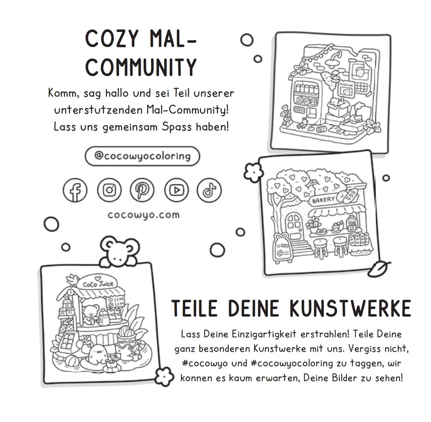 Your favorite coloring book now in German language! Dive into your very own relaxation corner with these brand-new coloring pages! This new book is a follow-up to Coco Wyo's beloved Little Corner and promises a new colorful delight in every corner! A wonderful reading nook, a warm bakery, a favorite kitchen, and many more are waiting for you in this new coloring book! Relaxation is found in every corner and hidden nook for your next coloring session with these cute and simple pages! Cozy Corner features sweet and irresistible images for coloring lovers of all ages!