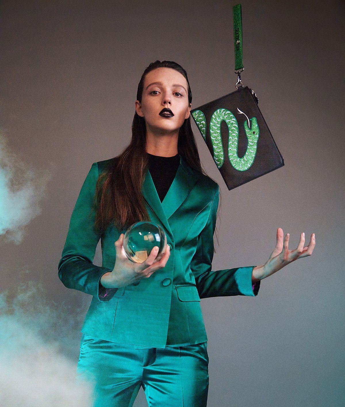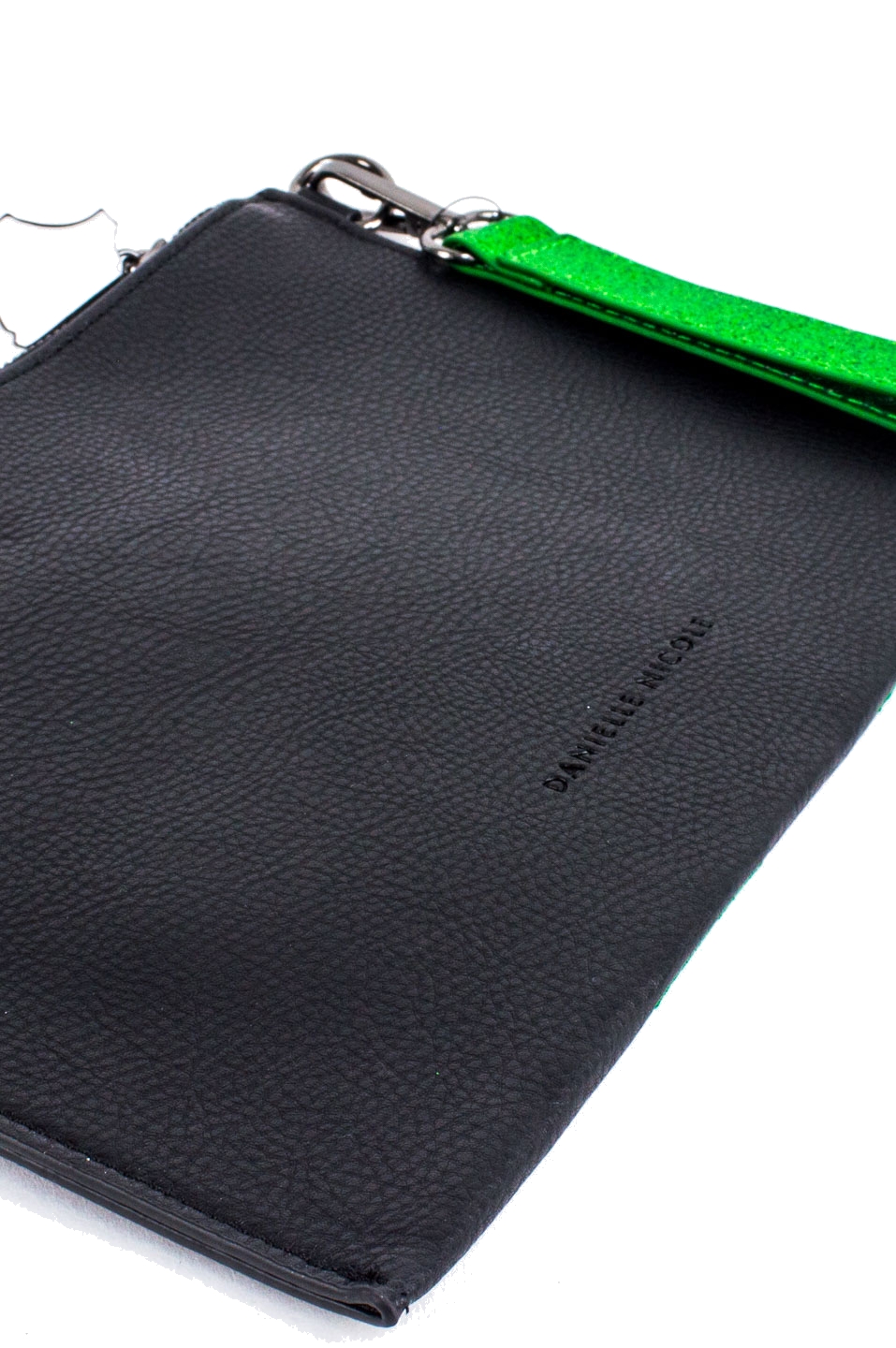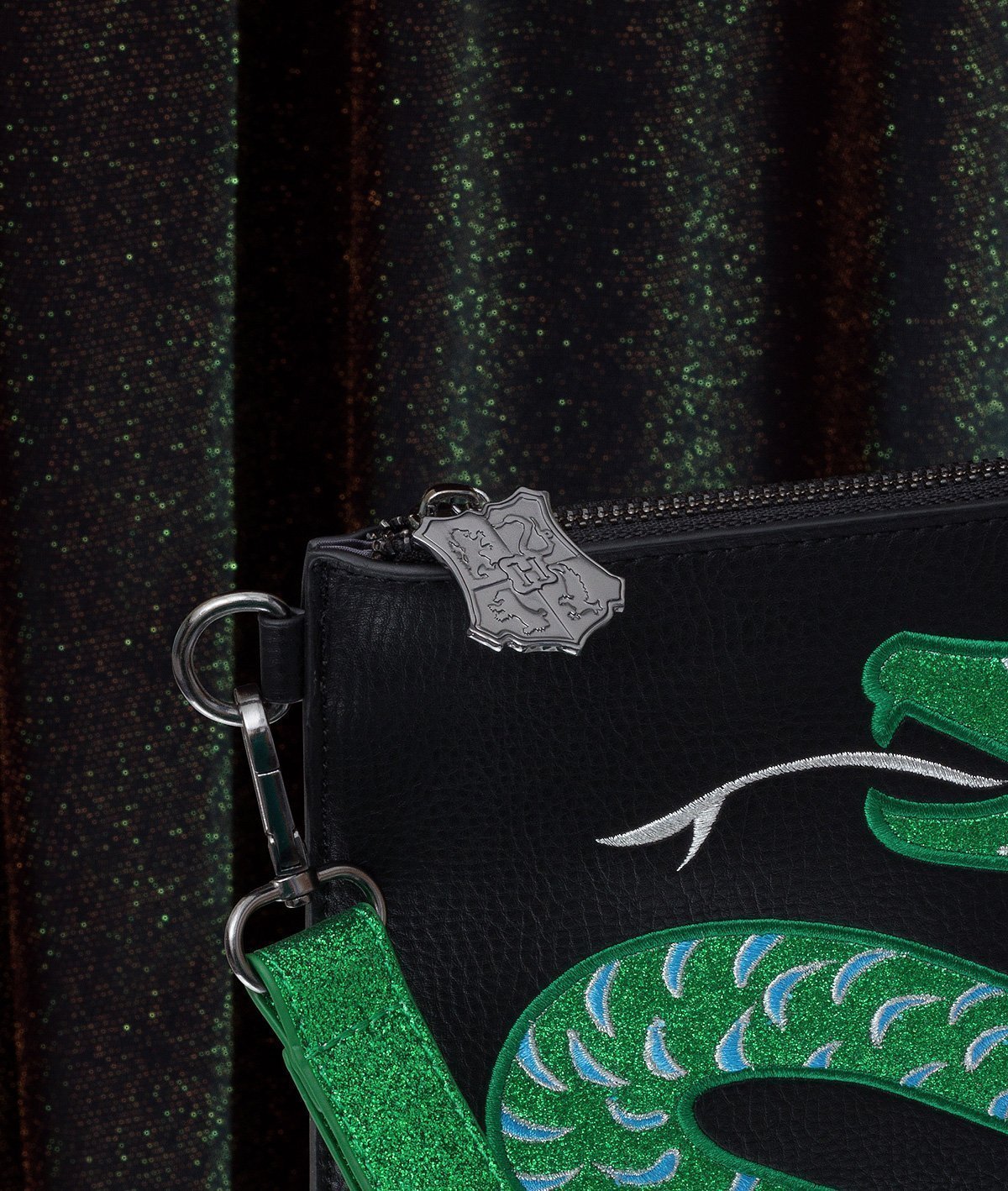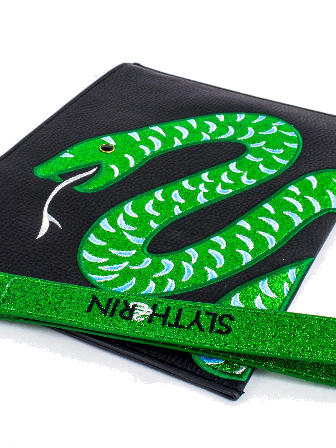 Show your Slytherin pride with this stylish snake pouch clutch, featuring green glitter embroidery. The clutch includes three interior back-wall card holders and a removable wristlet in house colors attached to the zipper puller. This is a collectible accessory inspired by the Harry Potter world, perfect for everyday use or special occasions.