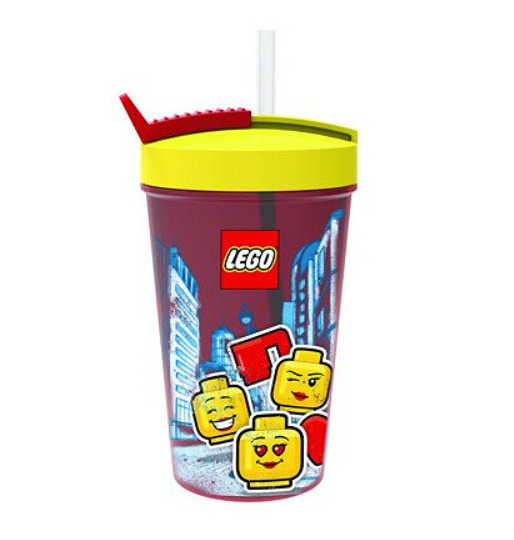 Hard plastic drinking cup featuring a classic print of female LEGO® minifigure heads, with a flexible straw. The sliding clip at the top is derived from the shape of the LEGO® Brick Separator.