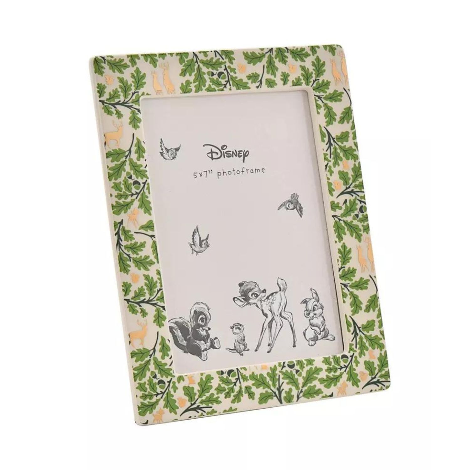 This eye-catching frame is a wonderful gift for Disney lovers and offers an attractive way to display your cherished photographs around the home. The ceramic frame features a colorful printed design of leaves and acorns on its white surface, enhanced by gold foil silhouettes of Bambi characters. The back is finished with luxurious black velveteen and is designed for portrait display using the attached strut.