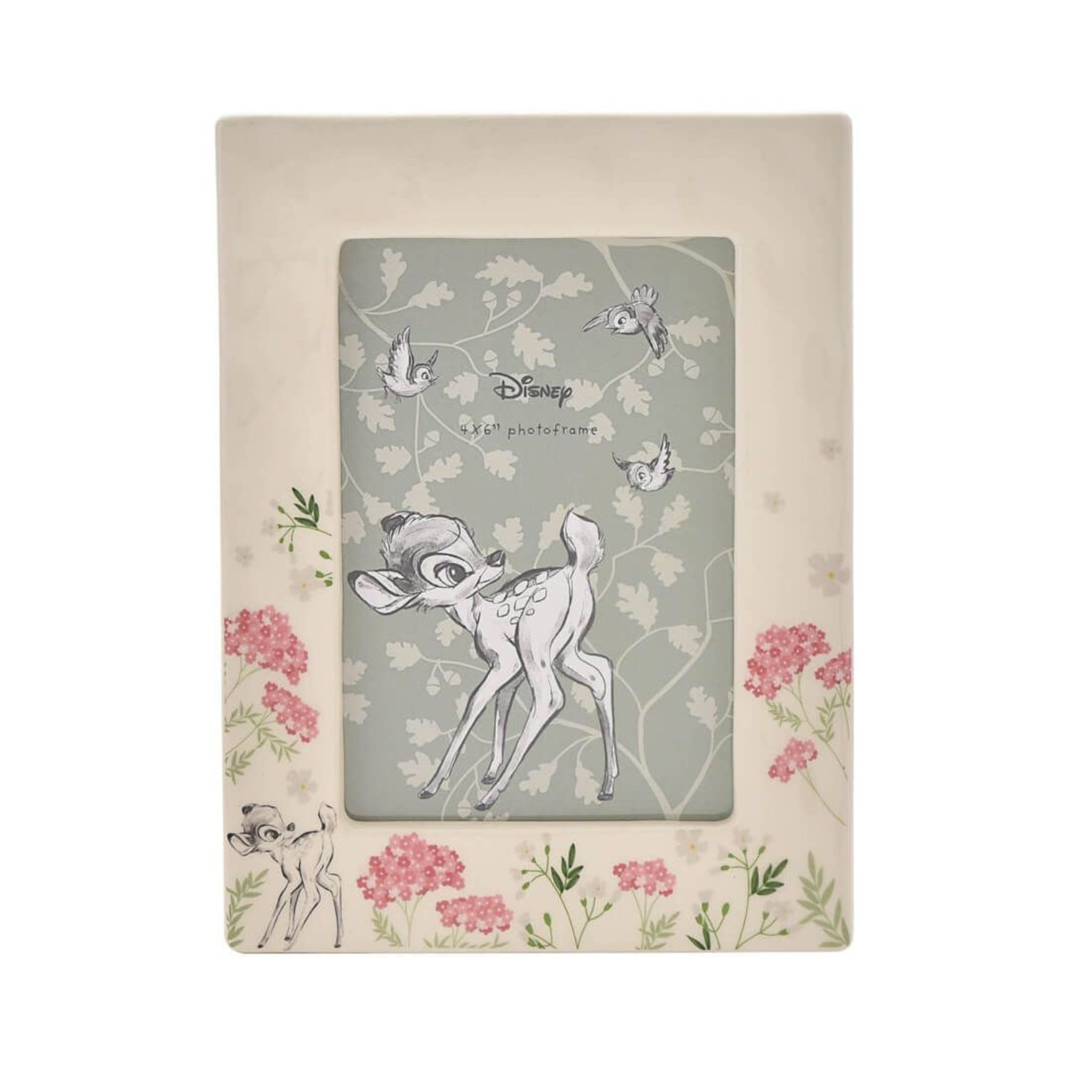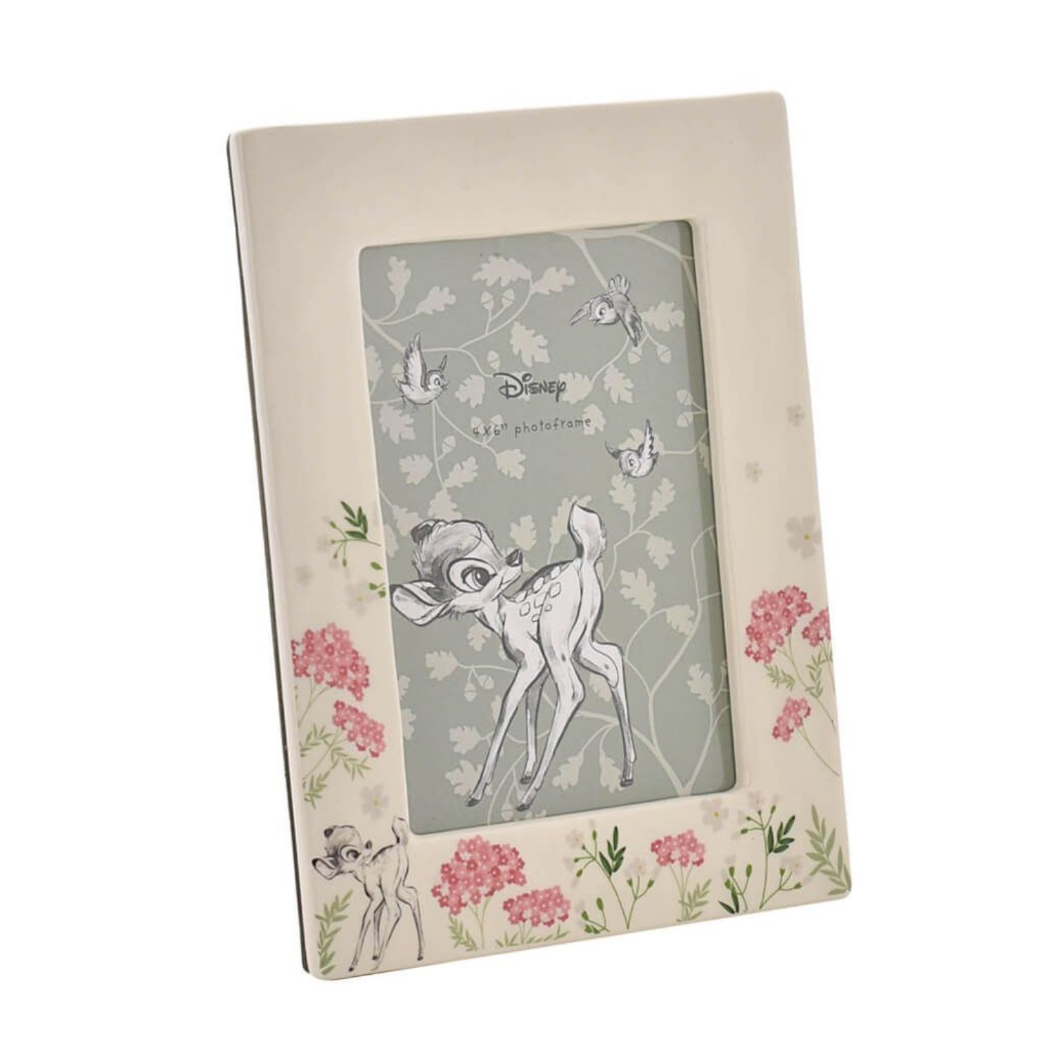 Showcase your precious memories with the Disney Home Bambi Ceramic Frame, a stylish decorative piece that brings Disney magic into your space. Featuring an elegant pencil sketch design of Bambi with colorful floral accents, this frame is perfect for displaying your favorite photo. The luxurious black velveteen backing adds a refined touch, while the gift box packaging makes it a perfect present for Disney lovers.