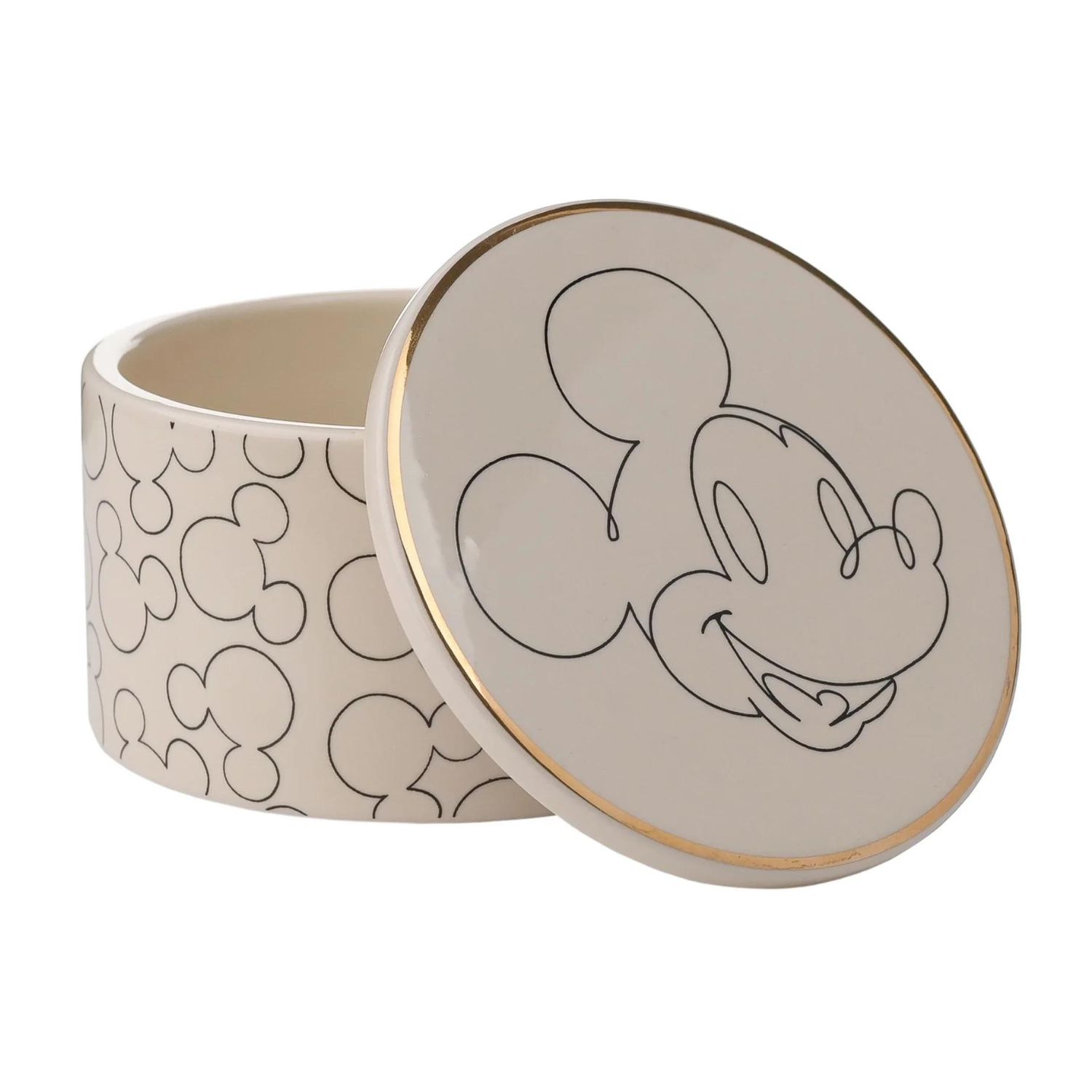 Discover the Mickey Single storage pot by DISNEY®. This stunning storage pot is a wonderful way for Disney fans to keep their valuables safe and secure. The pot features a beautiful white finish with an instantly recognizable Mickey illustration on the lid, complete with gold edge detail, and further Mickey head prints around the pot. The tightly closed lid opens to reveal ample storage space for trinkets, jewelry, and other small valuables. The pot is packaged in a color box.
