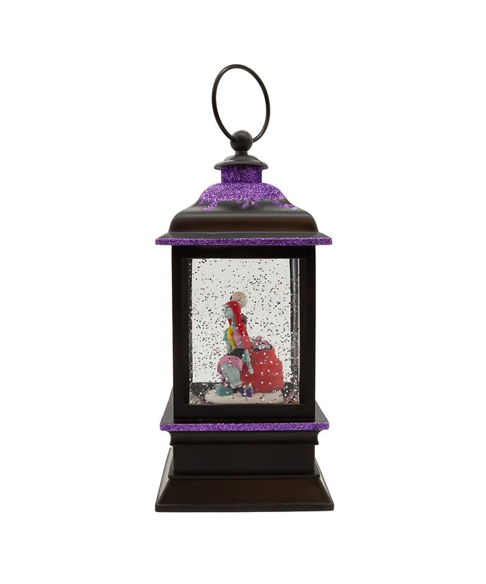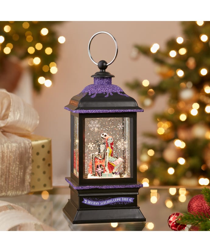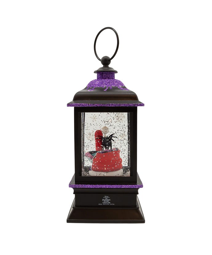 Bring magic and festive cheer to your home with this 9-inch musical lantern from Disney© by Kurt Adler, inspired by Nightmare Before Christmas. The lantern features Jack Skellington and Sally sitting on a toy sack surrounded by decorated presents. When activated, it is illuminated with one warm white LED light, plays cheerful music, and the swirling glitter effect creates a snowy scene, adding a magical holiday atmosphere.